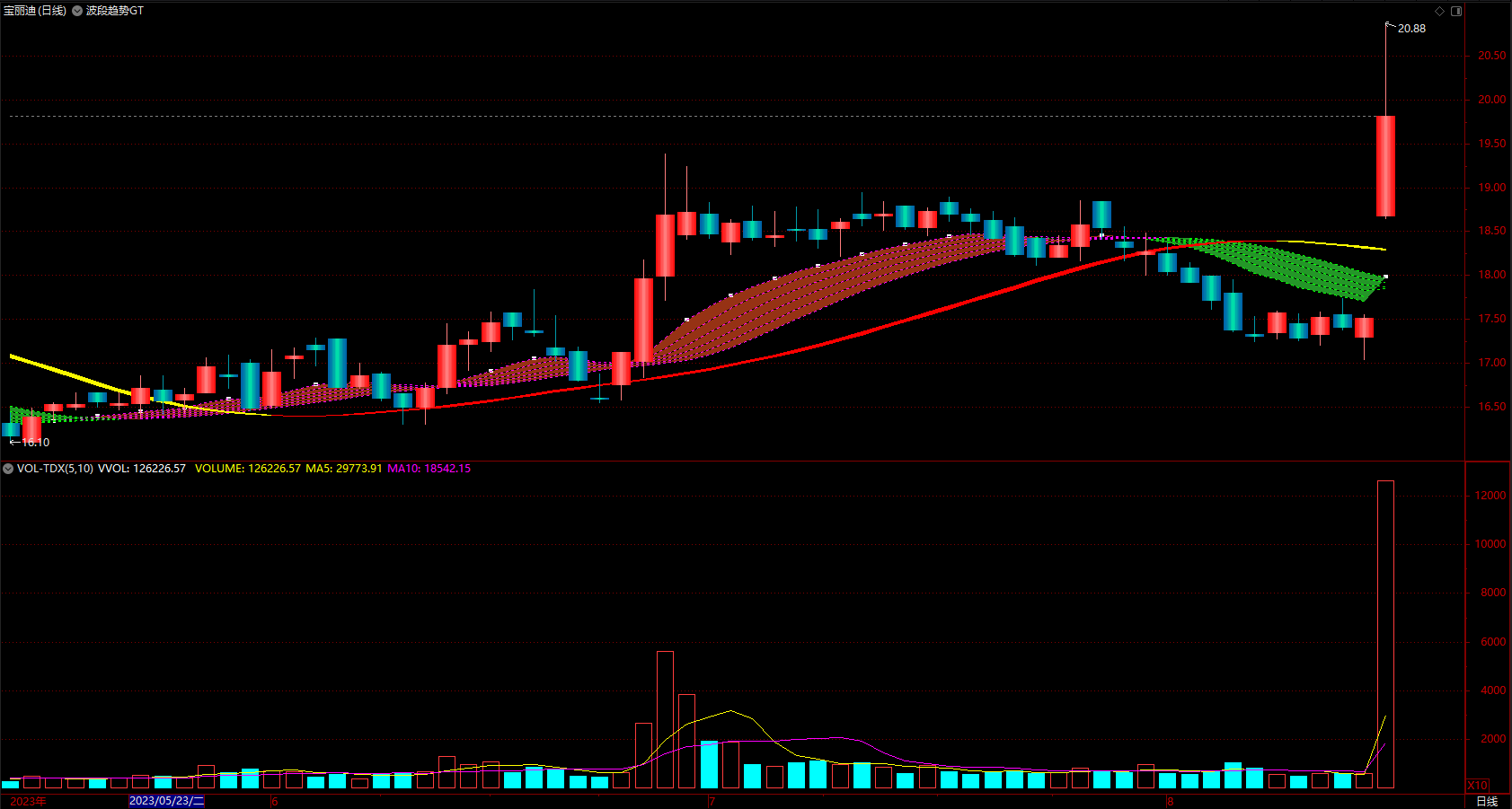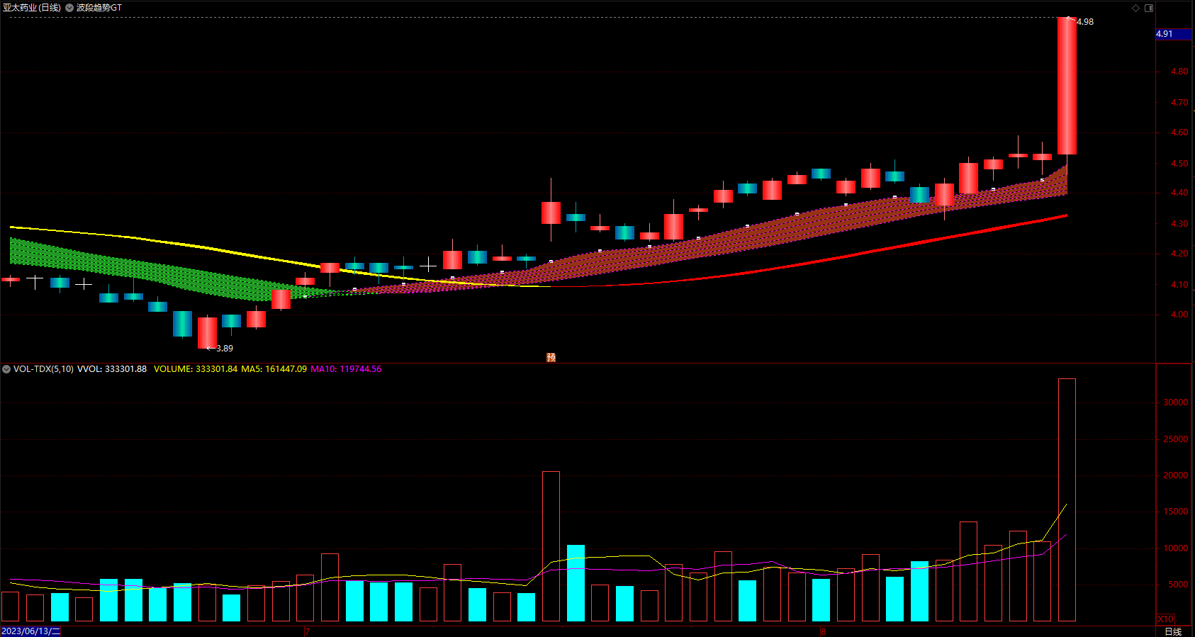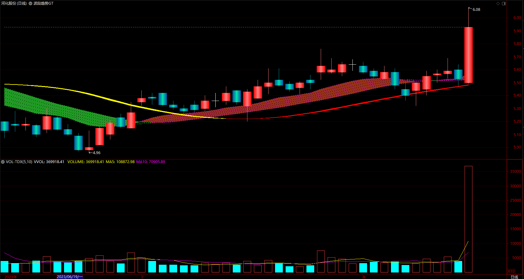 主图有红色粗带和绿色粗带,分别代表趋势走强、趋势走弱