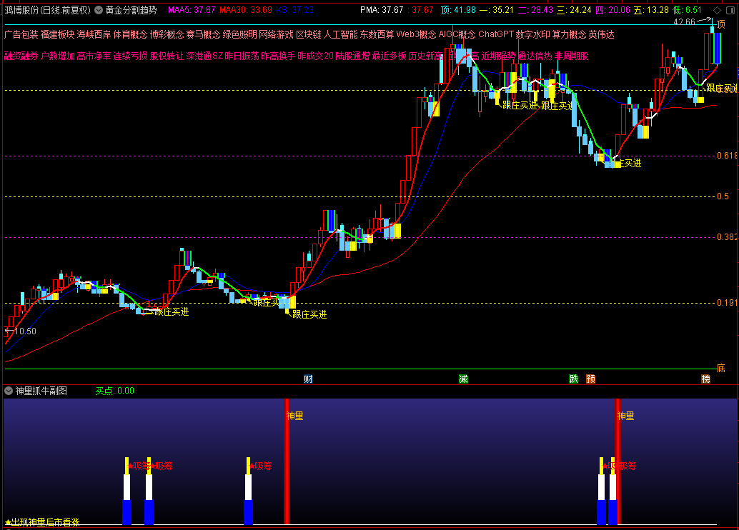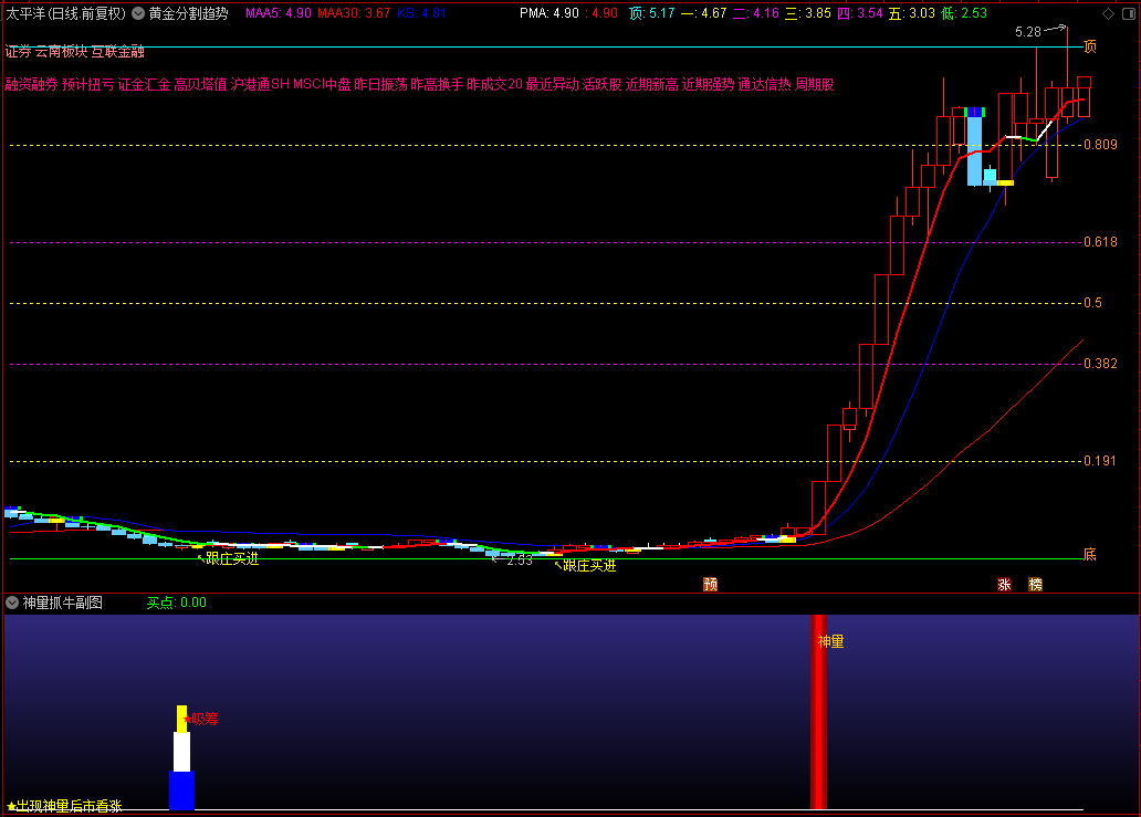 (【通达信】黄金分割主图+神量抓牛副图选股指标,短中线都适用的趋势工具!源码分享)