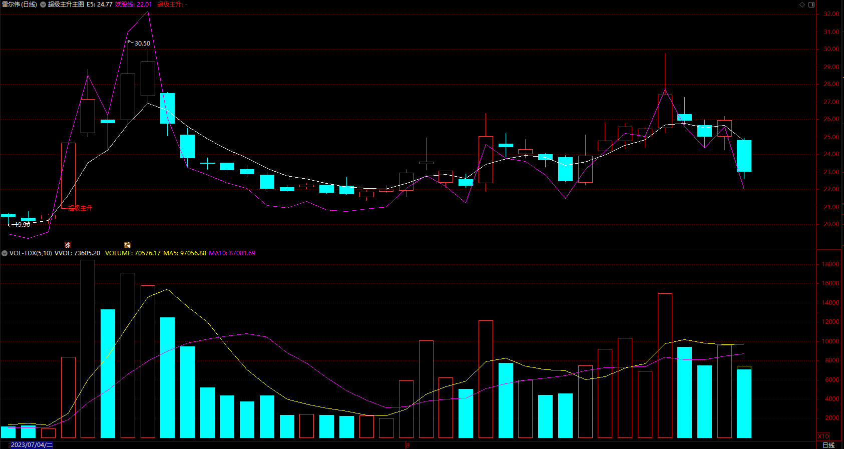 妖股线:(VAR6 + (((C - (VAR6)) * C) - (VAR6)) / (VAR6)),LINETHICK1,COLORMAGENTA;