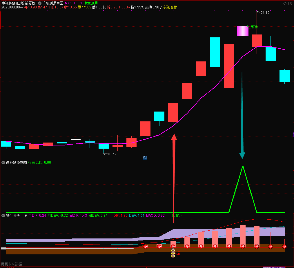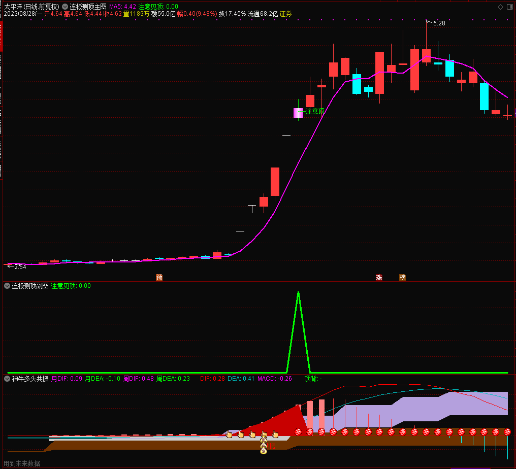(【通达信】神牛多头共振副图+连板测顶主副图选股公式,源码分享)