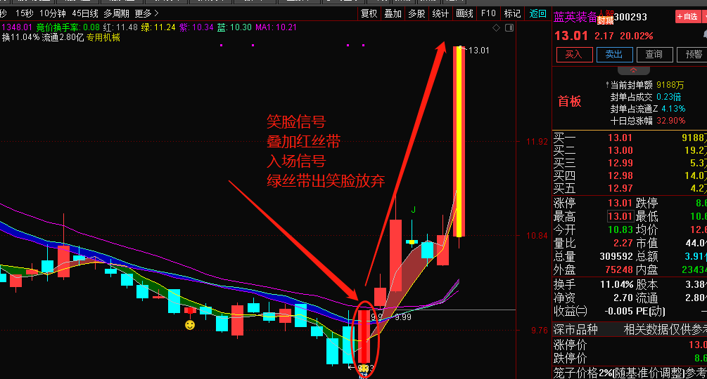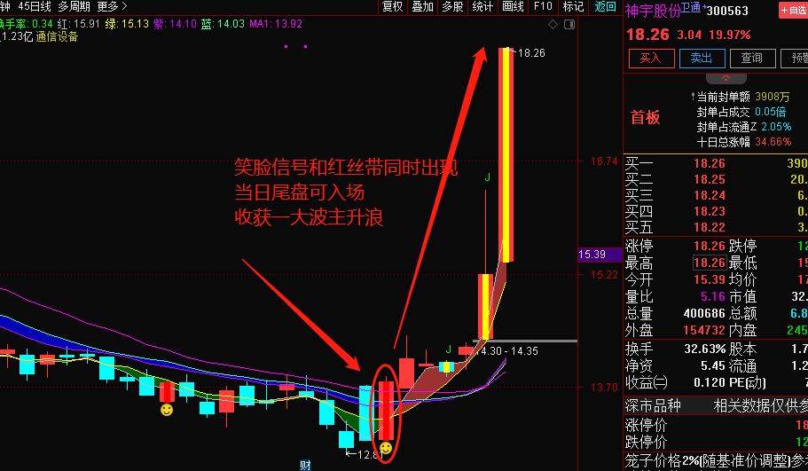 1、波段操作利器,出现笑脸信号后,可打底仓,等隔日出现红丝带后,可加仓买入;