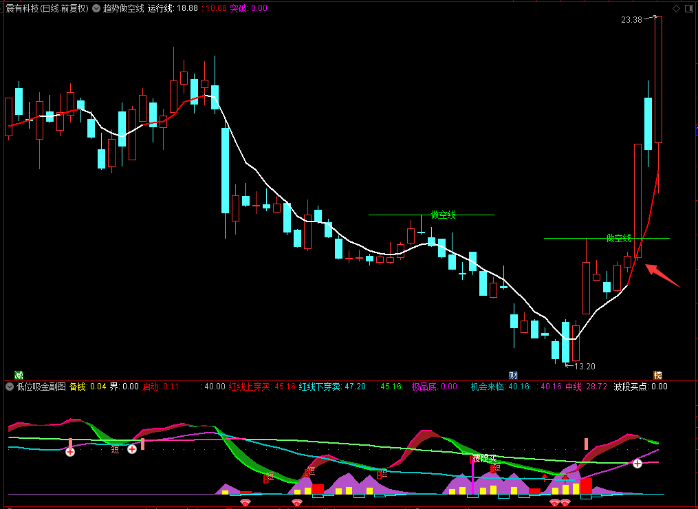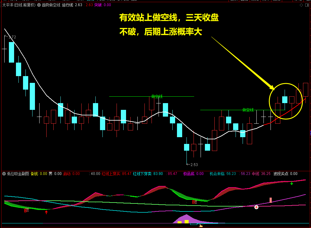 趋势做空线主图,股价有效3天站上做空线,上涨概率加大,后期上升比例增加;