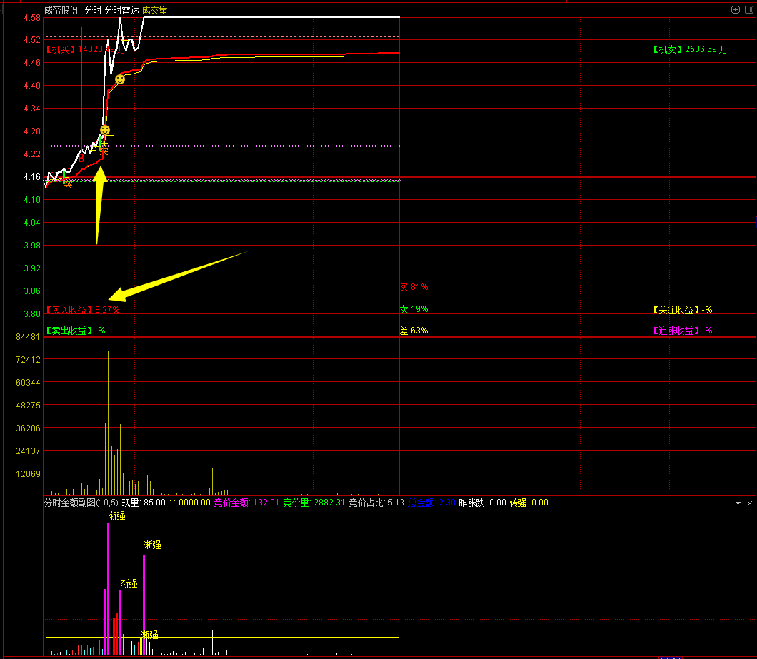 (【通达信】分时雷达主图+分时金额副图指标,主力买入卖出比例一目了然!源码分享)