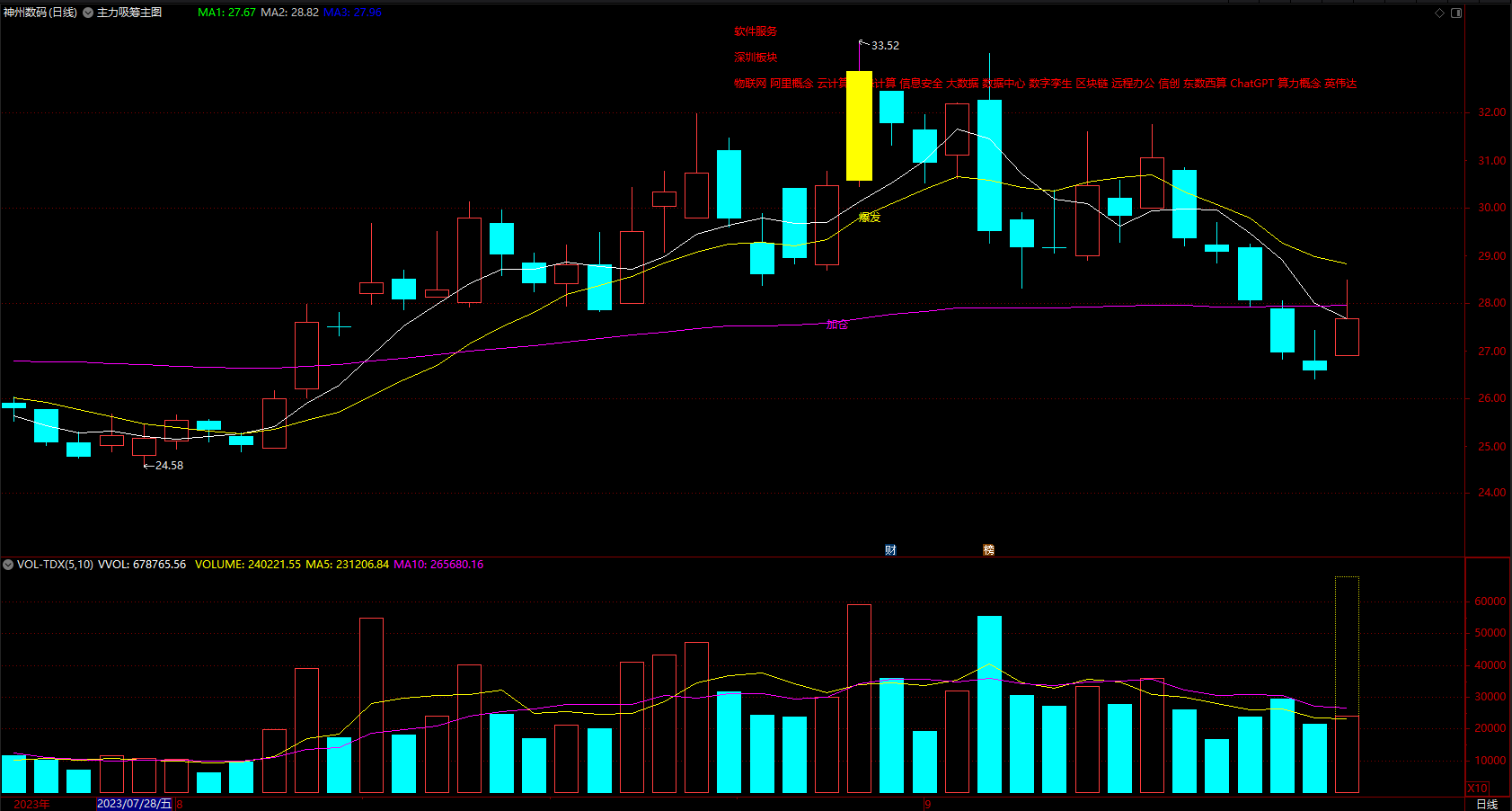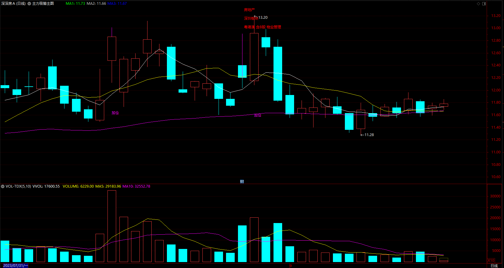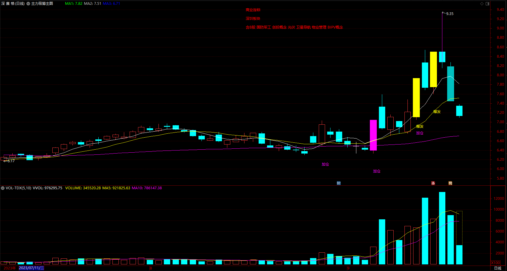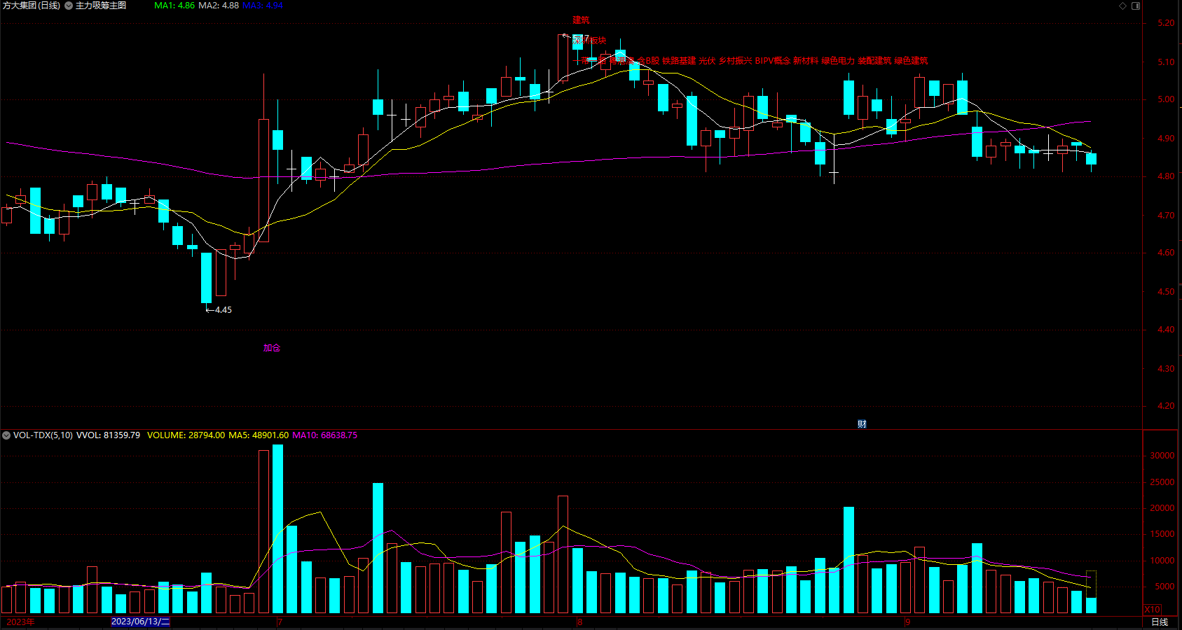 DRAWTEXT(X_8 AND 涨幅>5,MA3,'吸筹'),COLORWHITE;