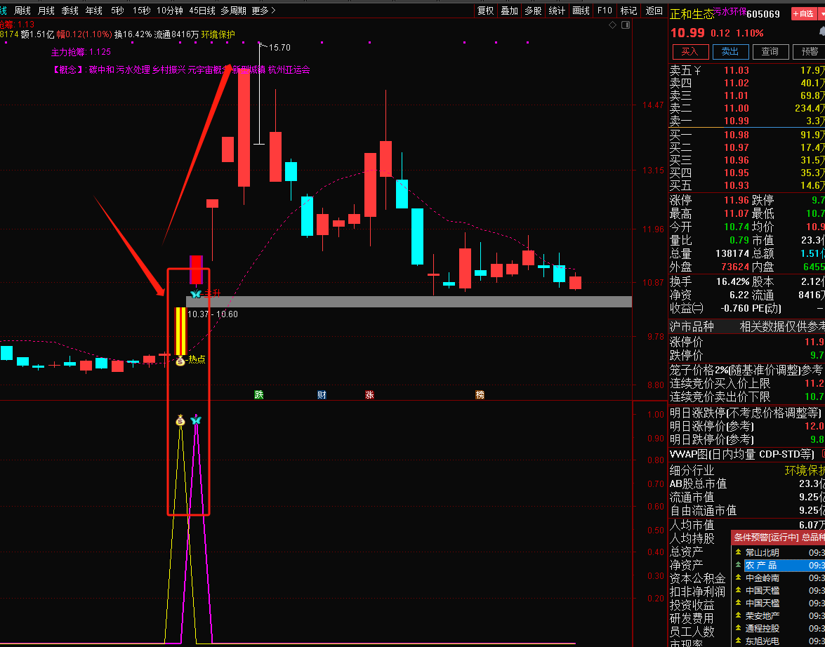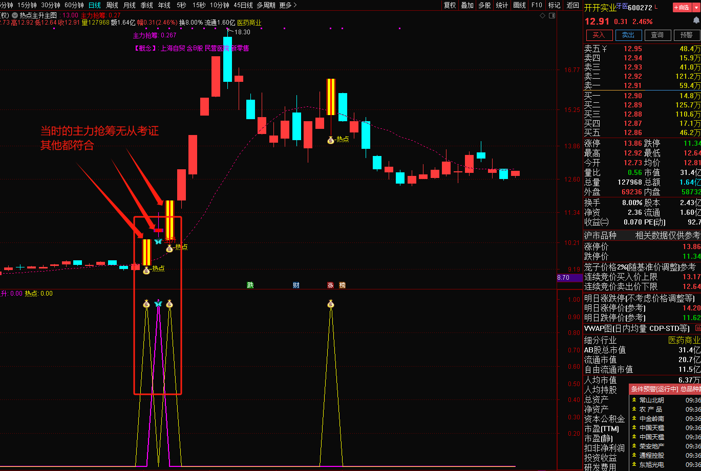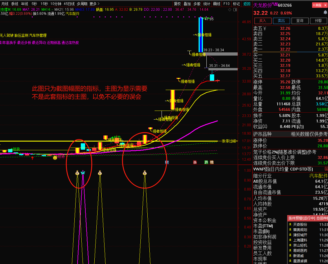 注意: 指标含capital函数(流通盘函数),DYNAINFO函数(财务函数)和CURRBARSCOUNT函数(求到最后交易日函数),信号不漂移!介意勿下!介意勿下!介意勿下!然指标只可作为参考,不作为投资依据,可配合其他指标共振使用,切勿迷信单一指标,以下图片举例。