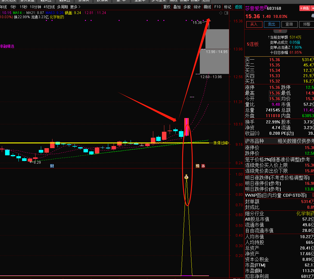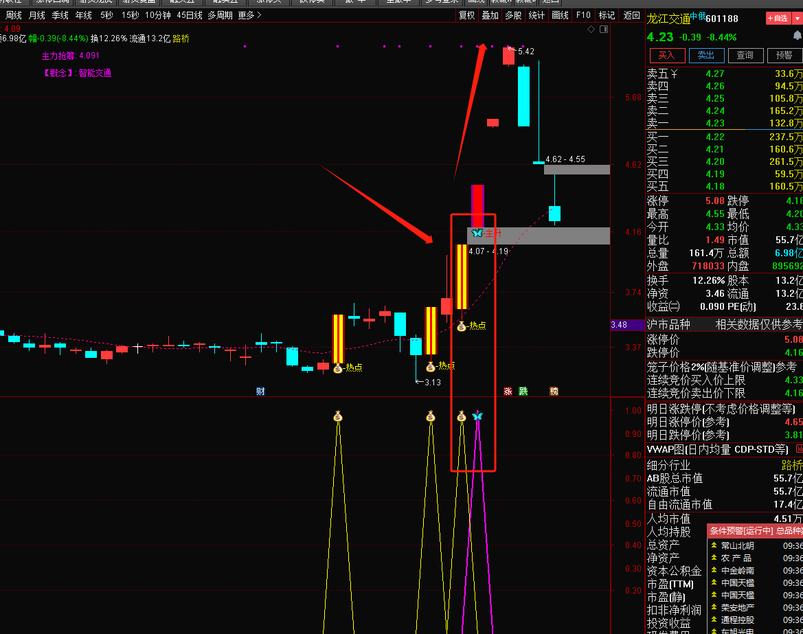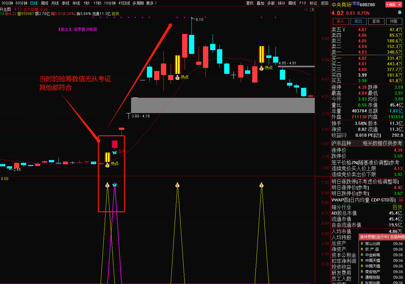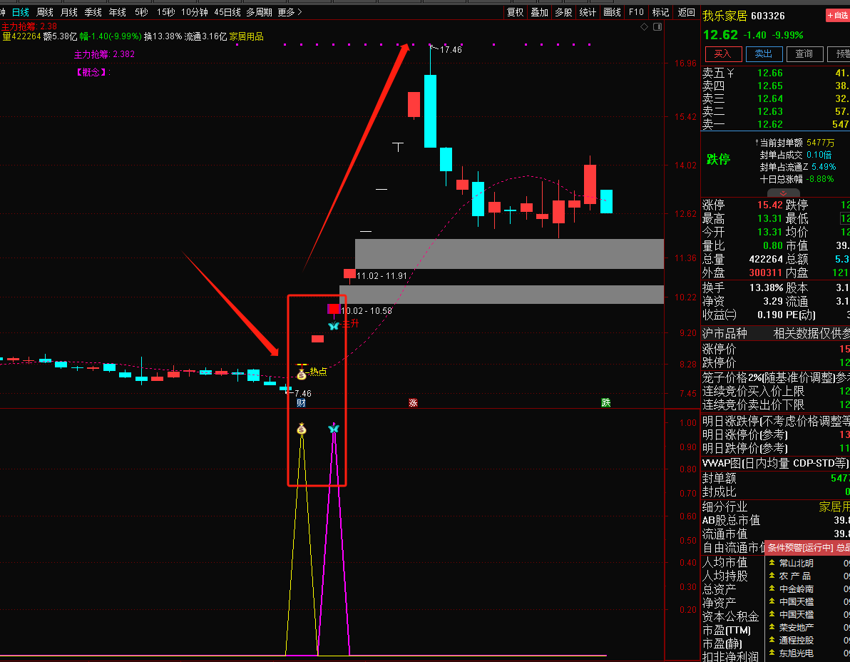 注意: 指标含capital函数(流通盘函数),DYNAINFO函数(财务函数)和CURRBARSCOUNT函数(求到最后交易日函数),信号不漂移!介意勿下!介意勿下!介意勿下!然指标只可作为参考,不作为投资依据,可配合其他指标共振使用,切勿迷信单一指标,以下图片举例。