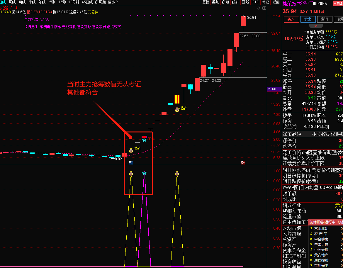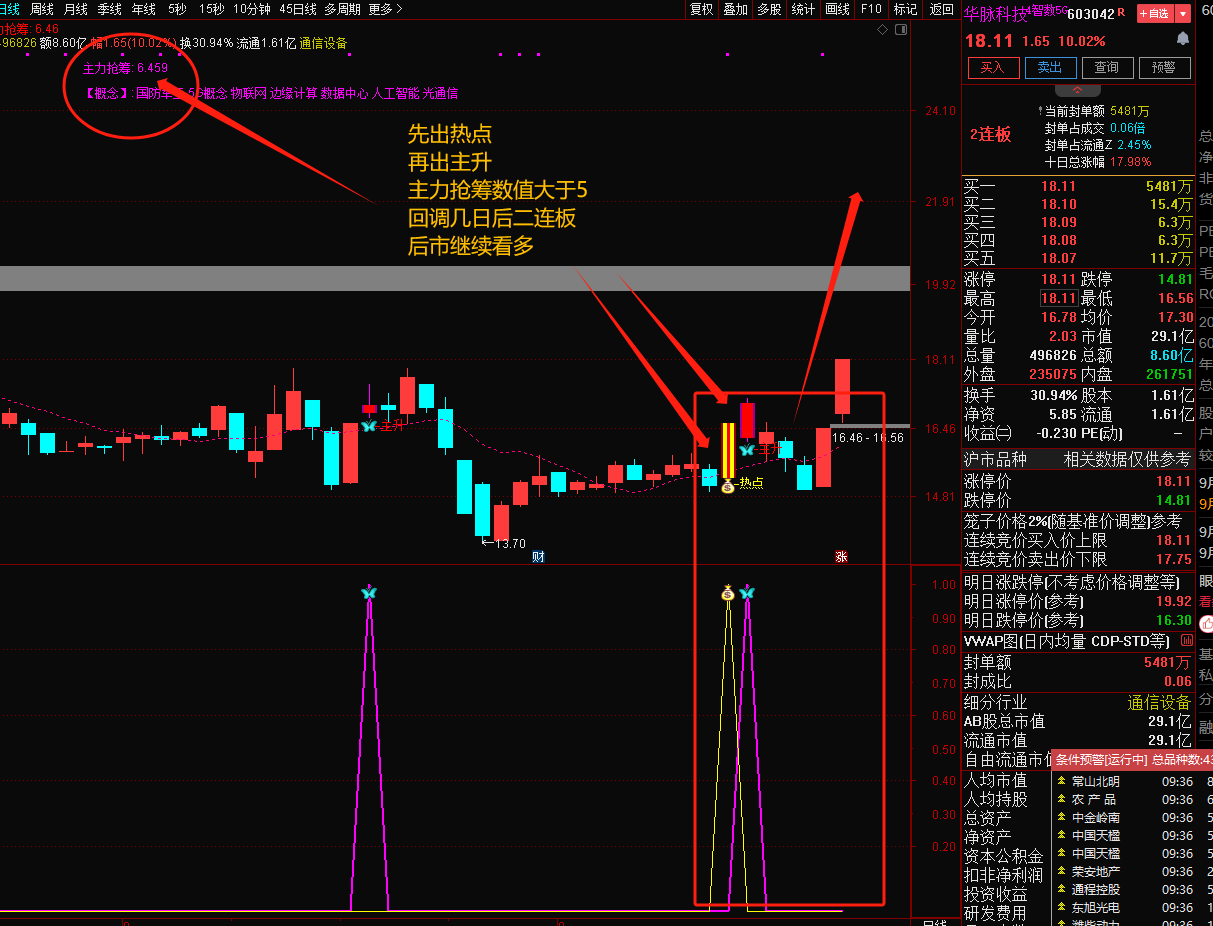 1、交易日9:25分竞价结束后首先用【热点、主升选股】选出当天的股票,一般出票3-5只,如果数量超过10只尽量不参与,说明当天主力分散;