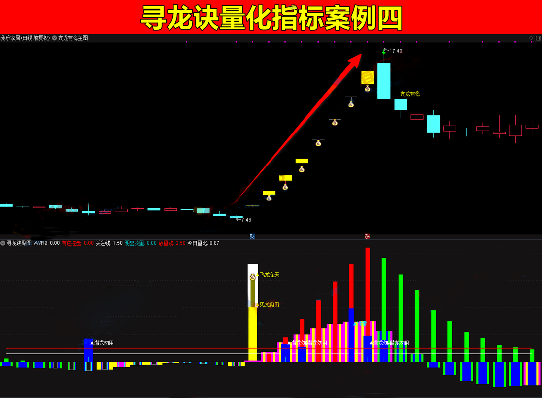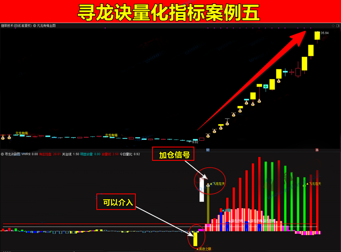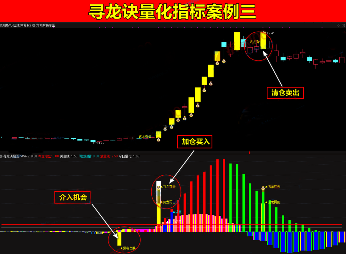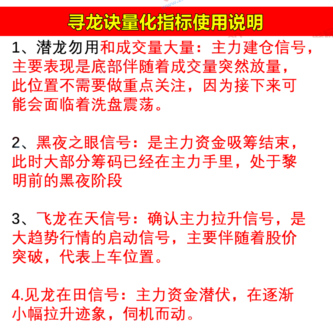 3、飞龙在天信号:确认主力拉升信号,是大趋势行情的启动信号,主要伴随着股价突破,代表上车位置。