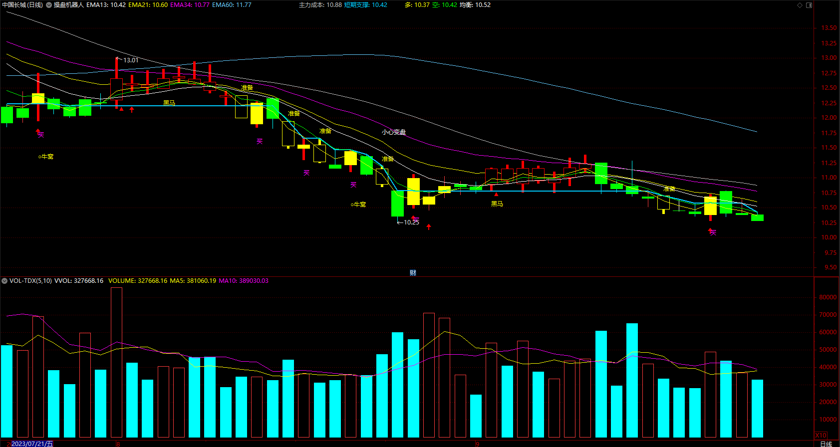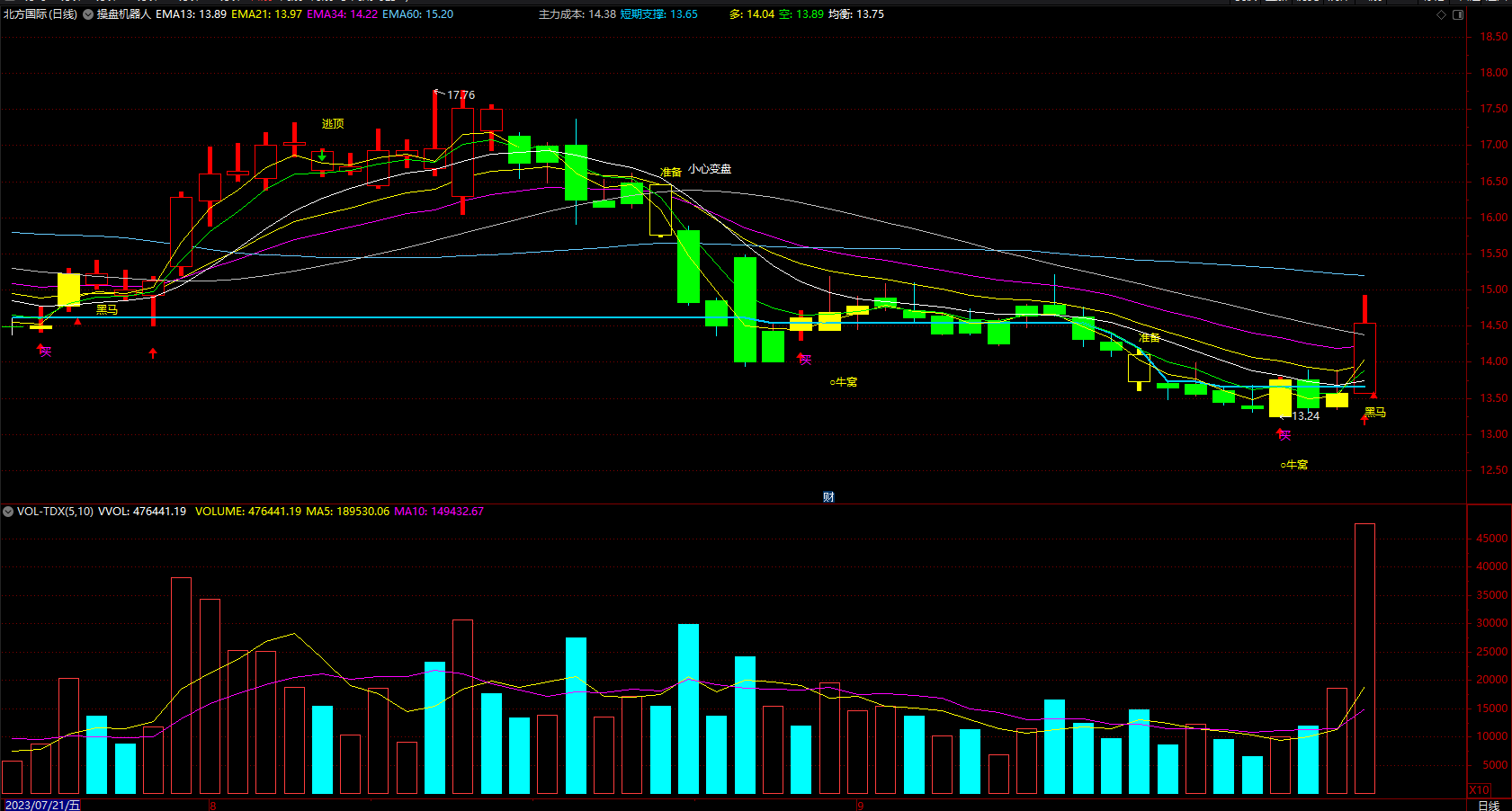 DRAWTEXT(CROSS(A1A,EMA(A1A,5))AND EMA(A1A,5)<A5A,L*0.98,'黑马'),COLORYELLOW;