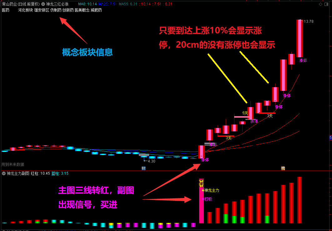 (【通达信】神龙三红上涨主图+神龙主力副图指标,源码分享)
