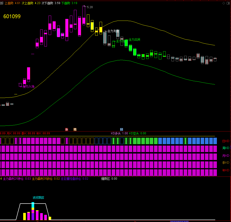 3、箱体无敌周期副图,由日周月季年 KD组合,红色框代表强势区域,绿色代表休息区域;