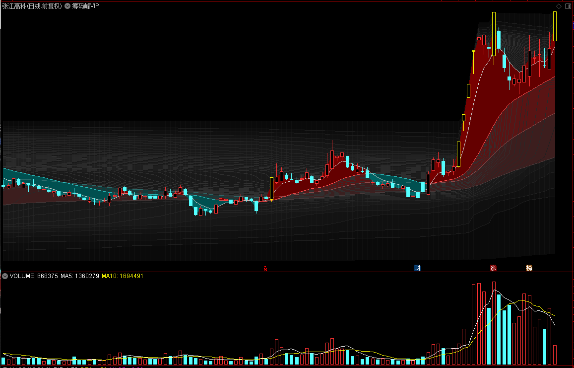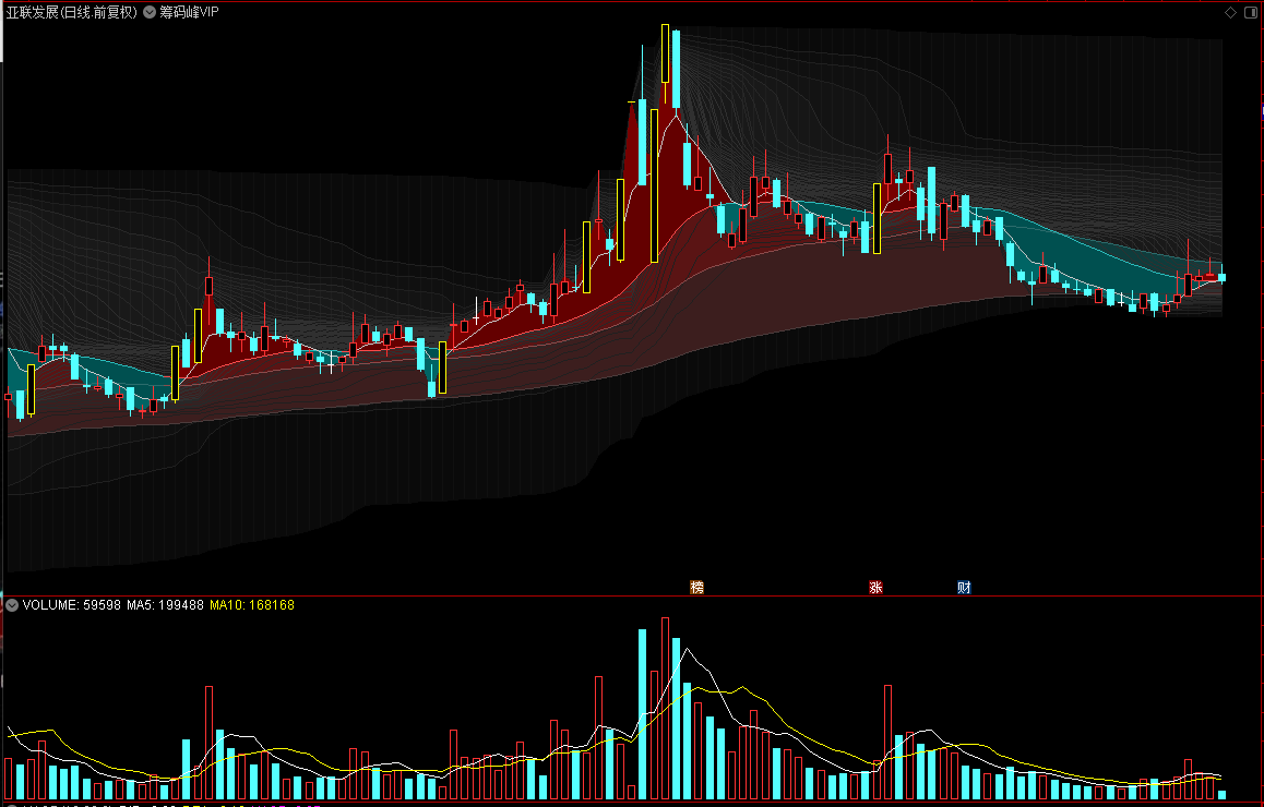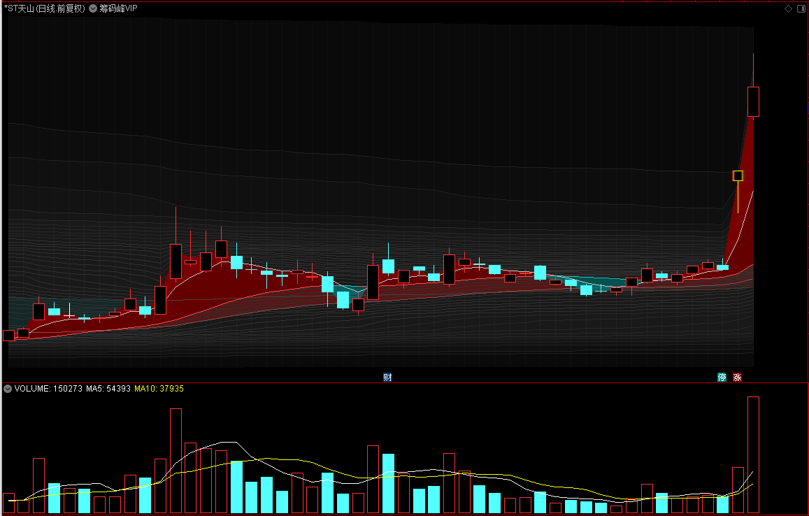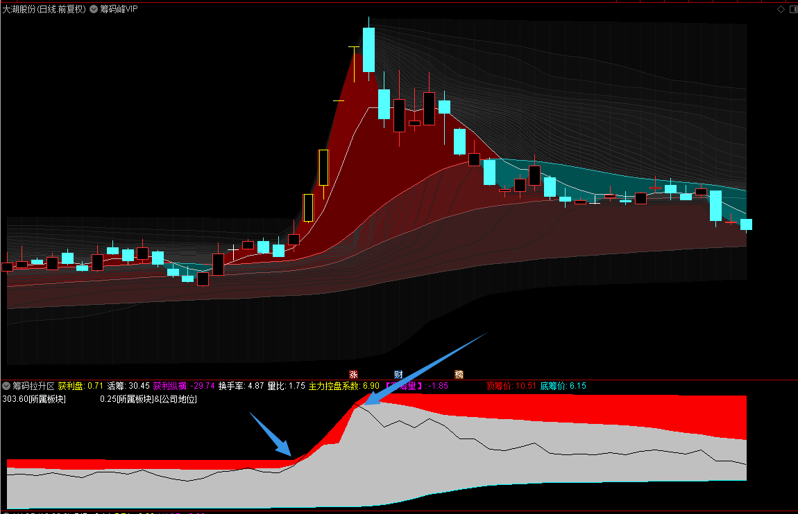 通达信筹码峰VIP主图+筹码拉升区副图指标,(主图上渐变式筹码散线+精准涨停标记+ama均线组合)源码分享