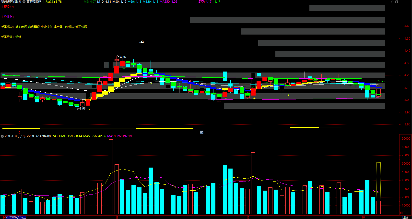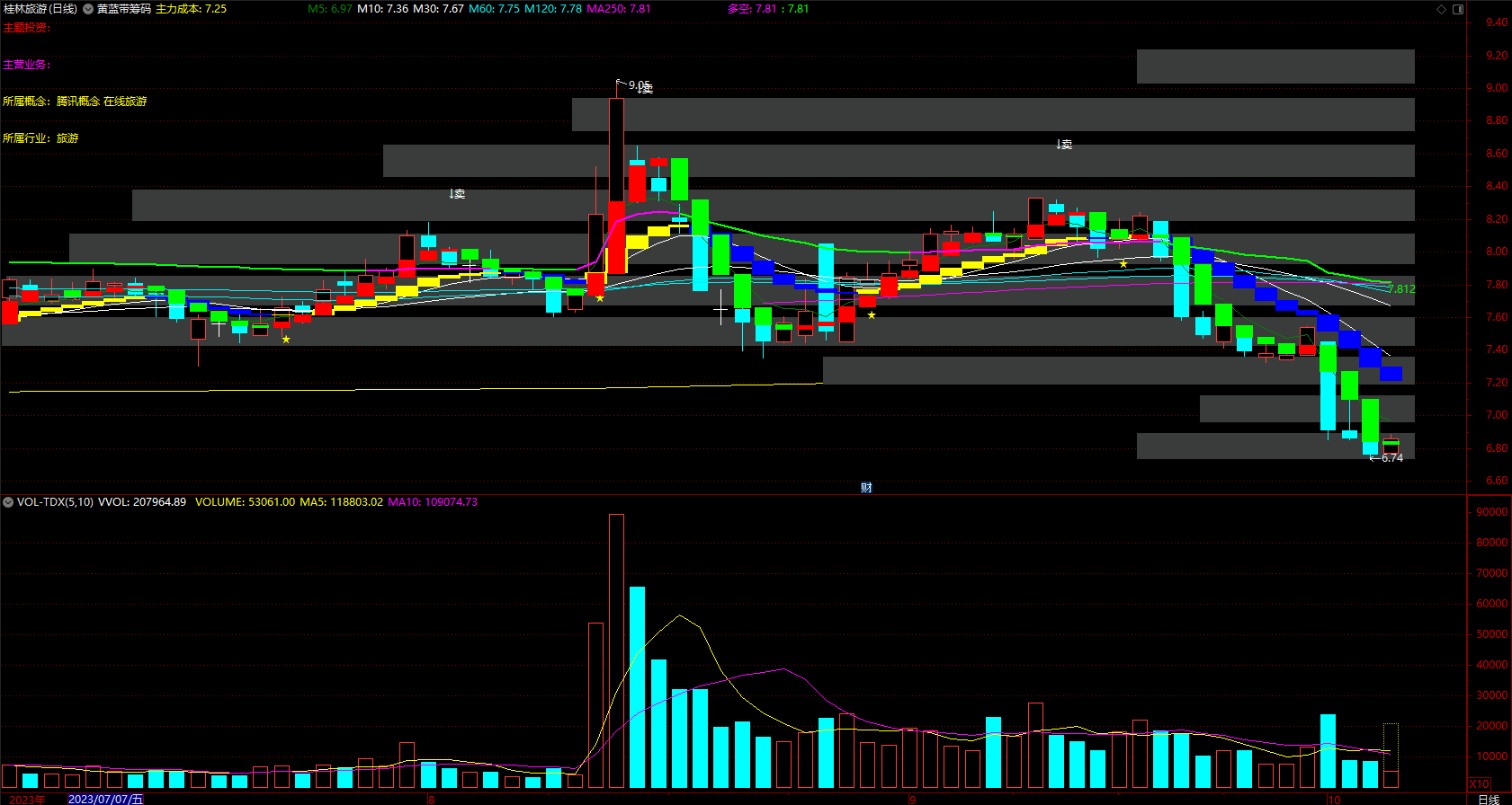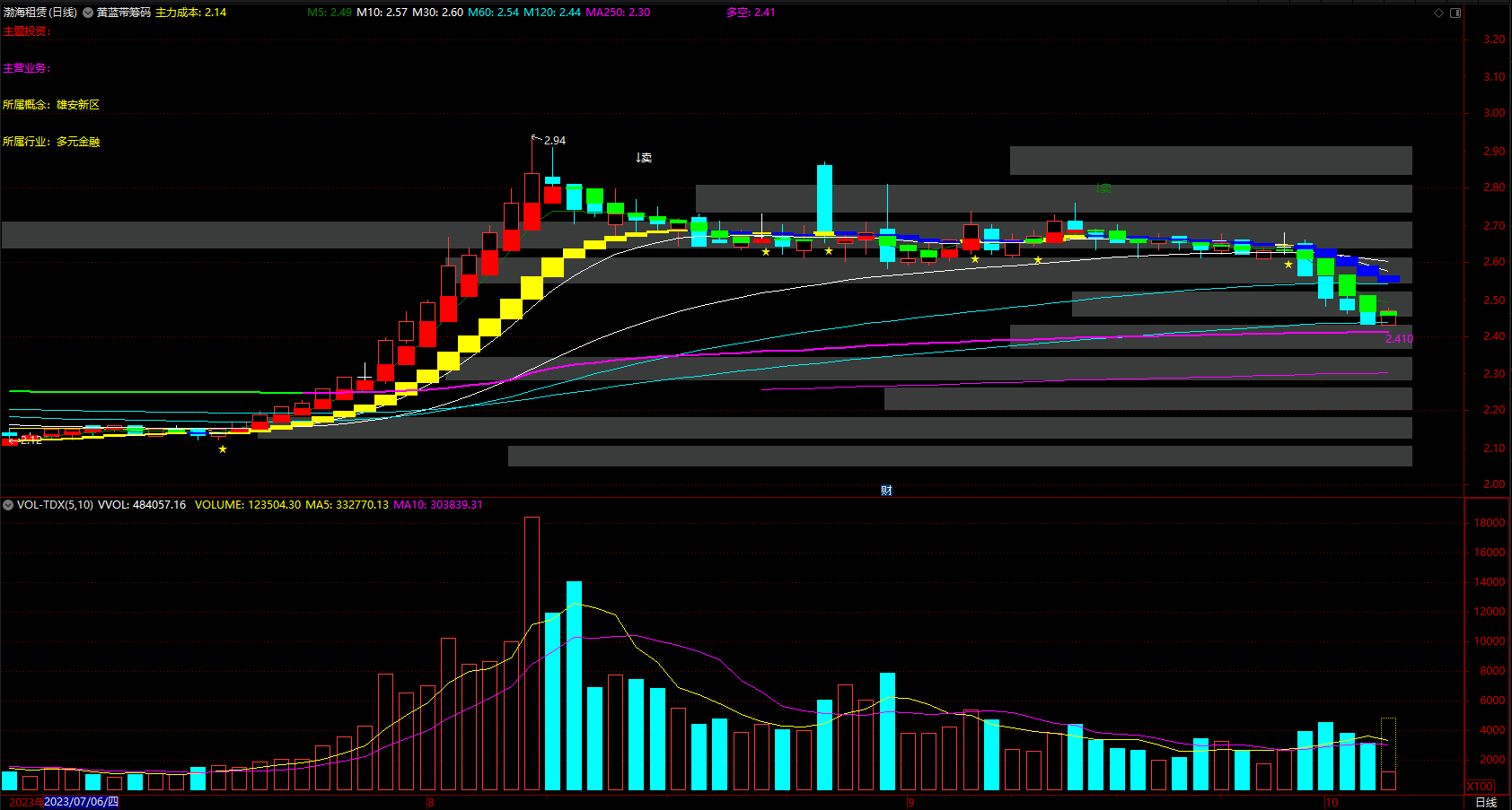 黄蓝带筹码峰 红色波段持股 绿柱下跌趋势