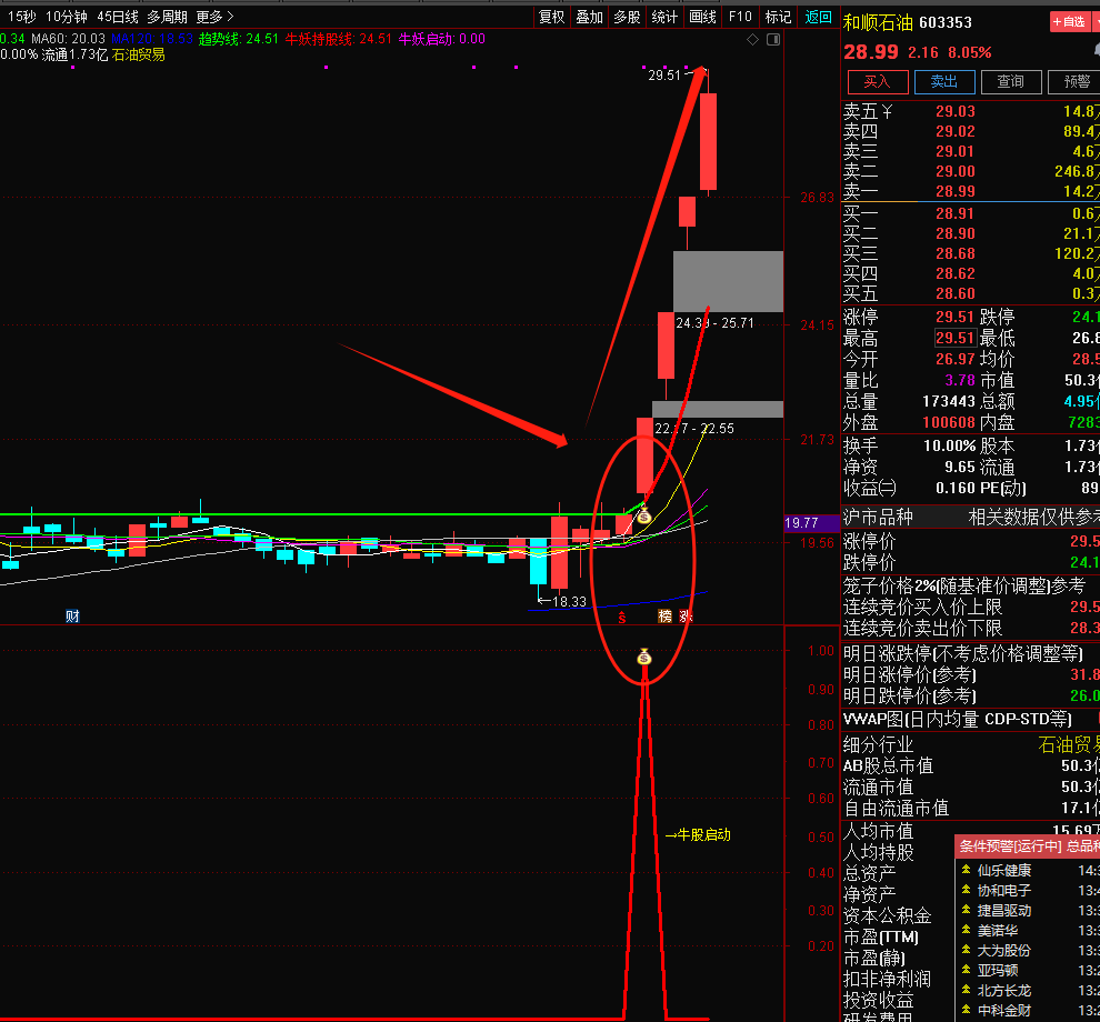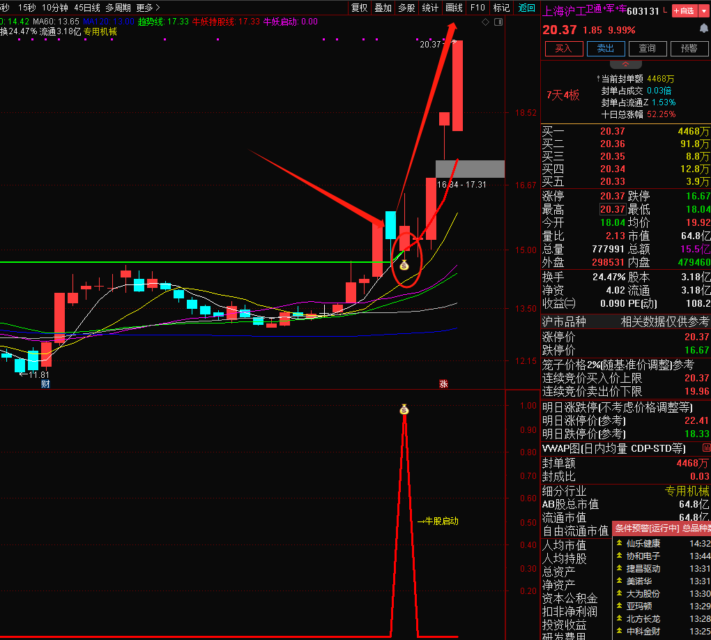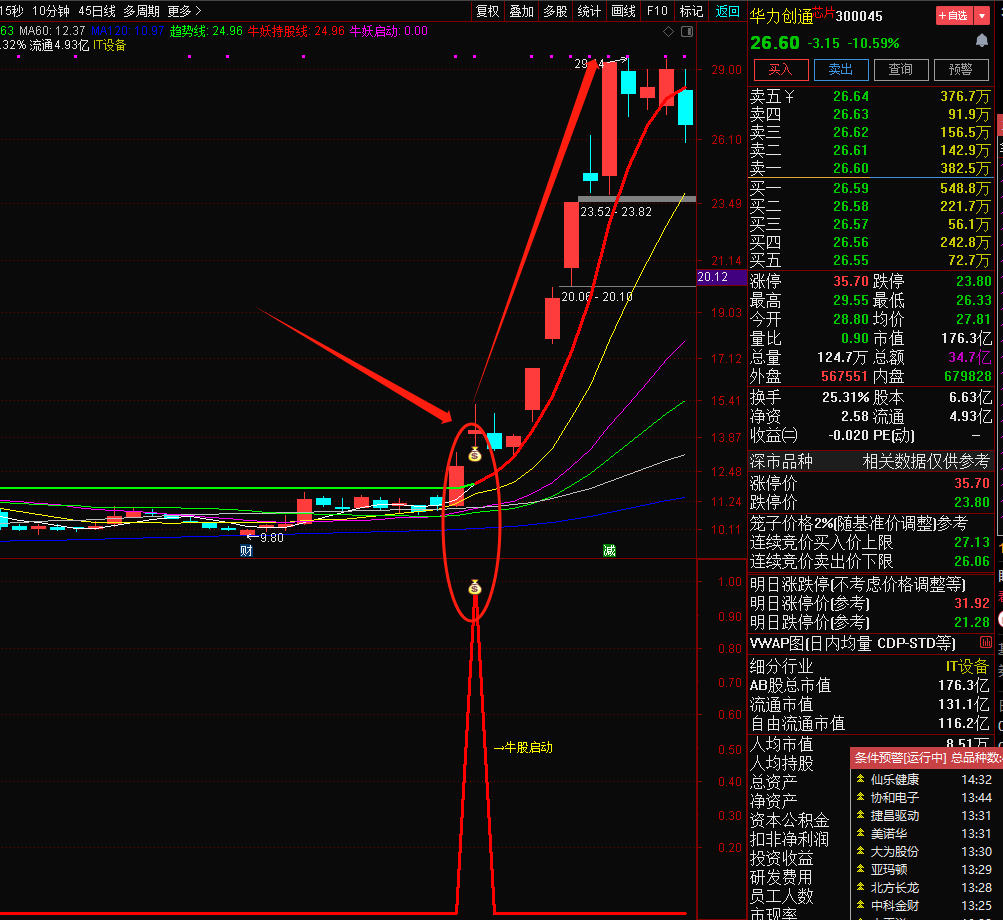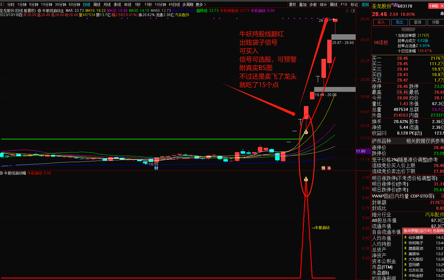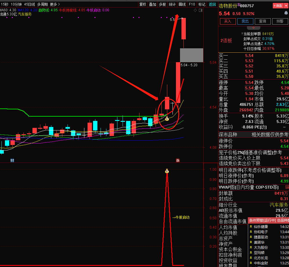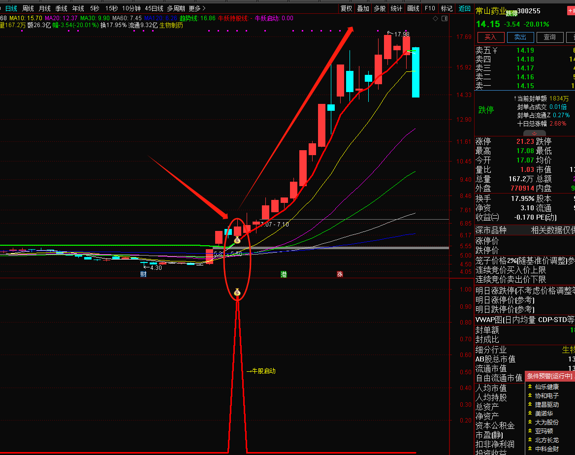2、牛妖持股线,股价在红色线上运行,并均线多头排列时可持有,破线则止盈或者止损。