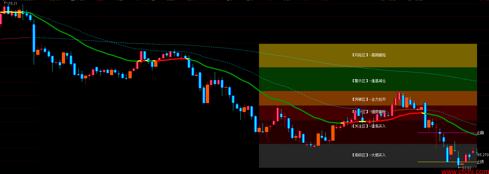 DRAWTEXT(CURRBARSCOUNT=N/4+5,GD-KJ*0.3,'【警示区】--逢高减仓'),COLORFFFFFF;