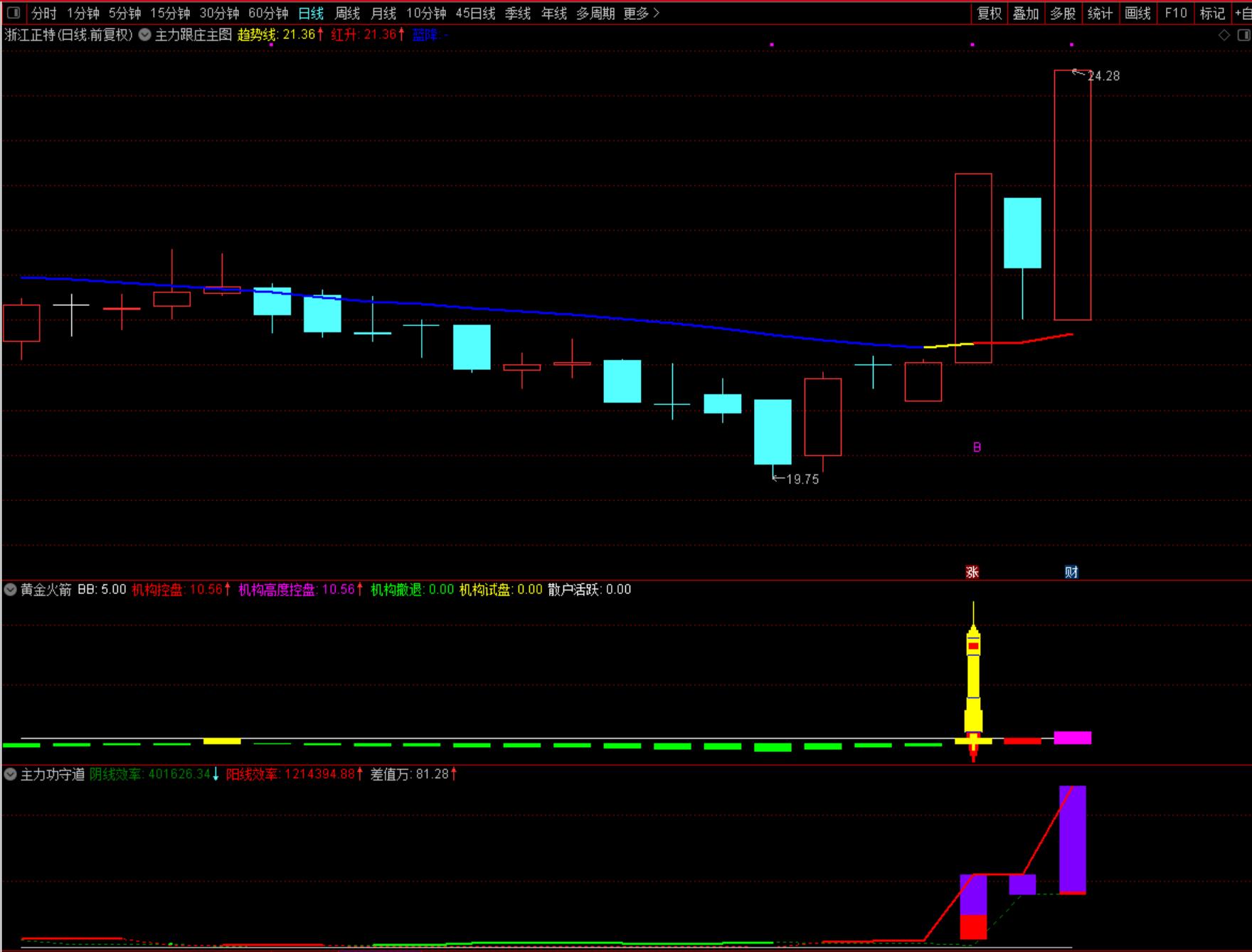 黄金火箭战法的核心是主力跟庄主图出B点买点,黄金火箭副图出黄金火箭信号,同时主力攻守道副图出现粉色蓝柱,三剑合壁是最佳介入点,然后跟庄主图趋势线变红,趋势向上,黄金火箭副图量能柱红色或黄色,主力攻守道副图持续出现粉色蓝柱并且阳线效率指标线上行可持股。。。当然对于长期看好的或者热点板块龙头股,也可以适当放低要求,在火箭火箭出信号的基础上,两三天内主图出B点,同时主力攻守道副图出粉色蓝柱,可以介入。。。本帖包含主力跟庄主图,黄金火箭副图,主力攻守道副图和黄金火箭选股器四个指标公式。。。