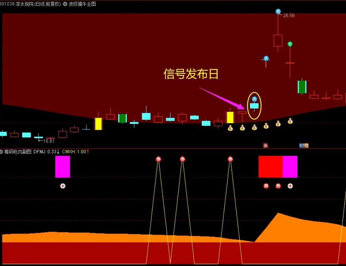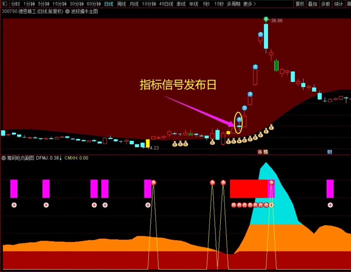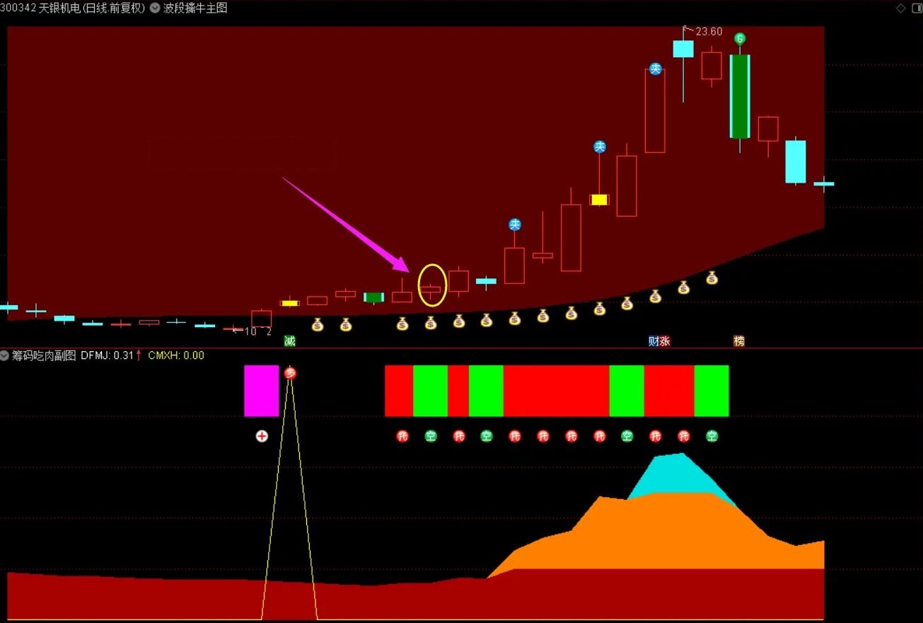 【通达信】波段擒牛主图+筹码吃肉副图套装指标,波段趋势找入场点 !