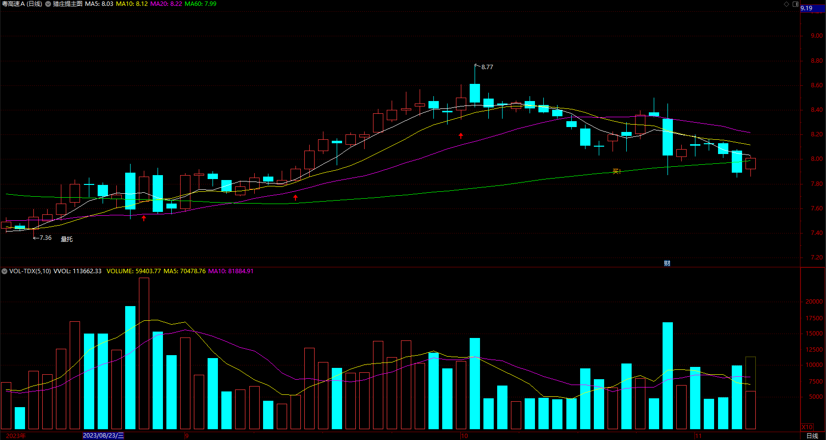 DRAWTEXT(CROSS(MA(VOL,10),MA(VOL,20)) AND MA(VOL,5)>MA(VOL,10) AND L<MA(C,20) AND C>=MA(C,20),L*0.98,'量托'),COLORWHITE;