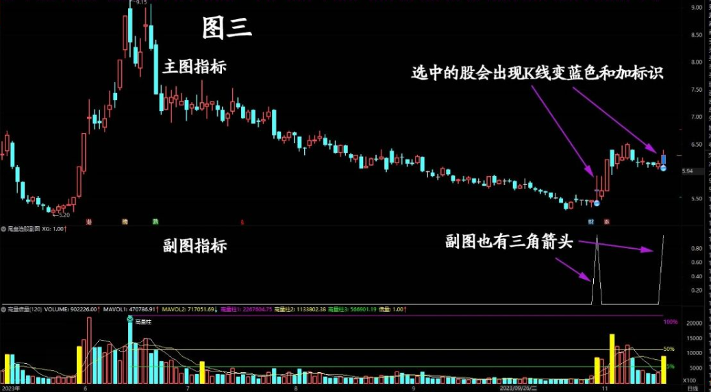 指标包含选股、主图、副图三个指标,(以选股为主,其它为辅)。