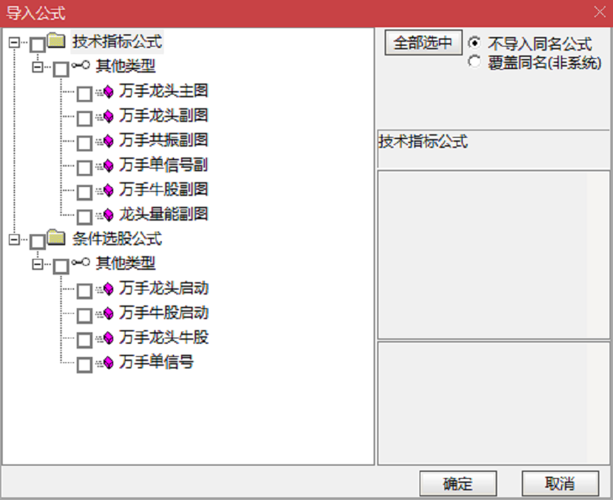 8、四个选股公式分别为:主图显示的万手单信号,龙头启动信号,副图的牛股启动信号 和三种信号共振选股。