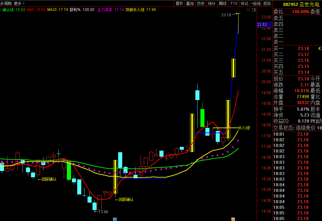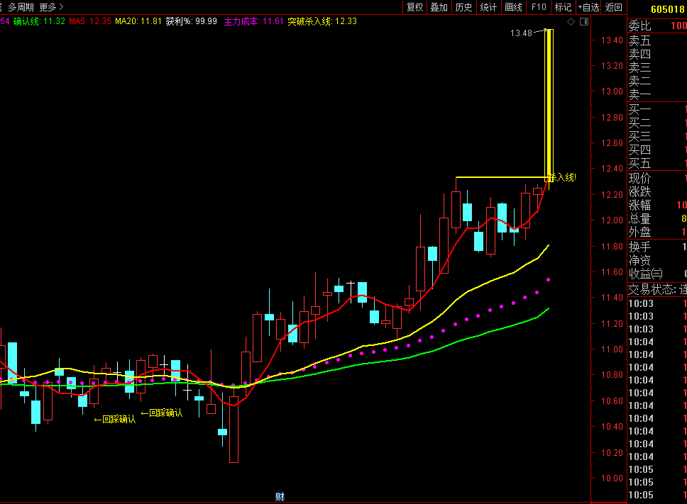 股价回踩并站在确认线之上,确认线是走平或拐头向上的,可重点关注!突破杀软线可考虑介入、或加仓。