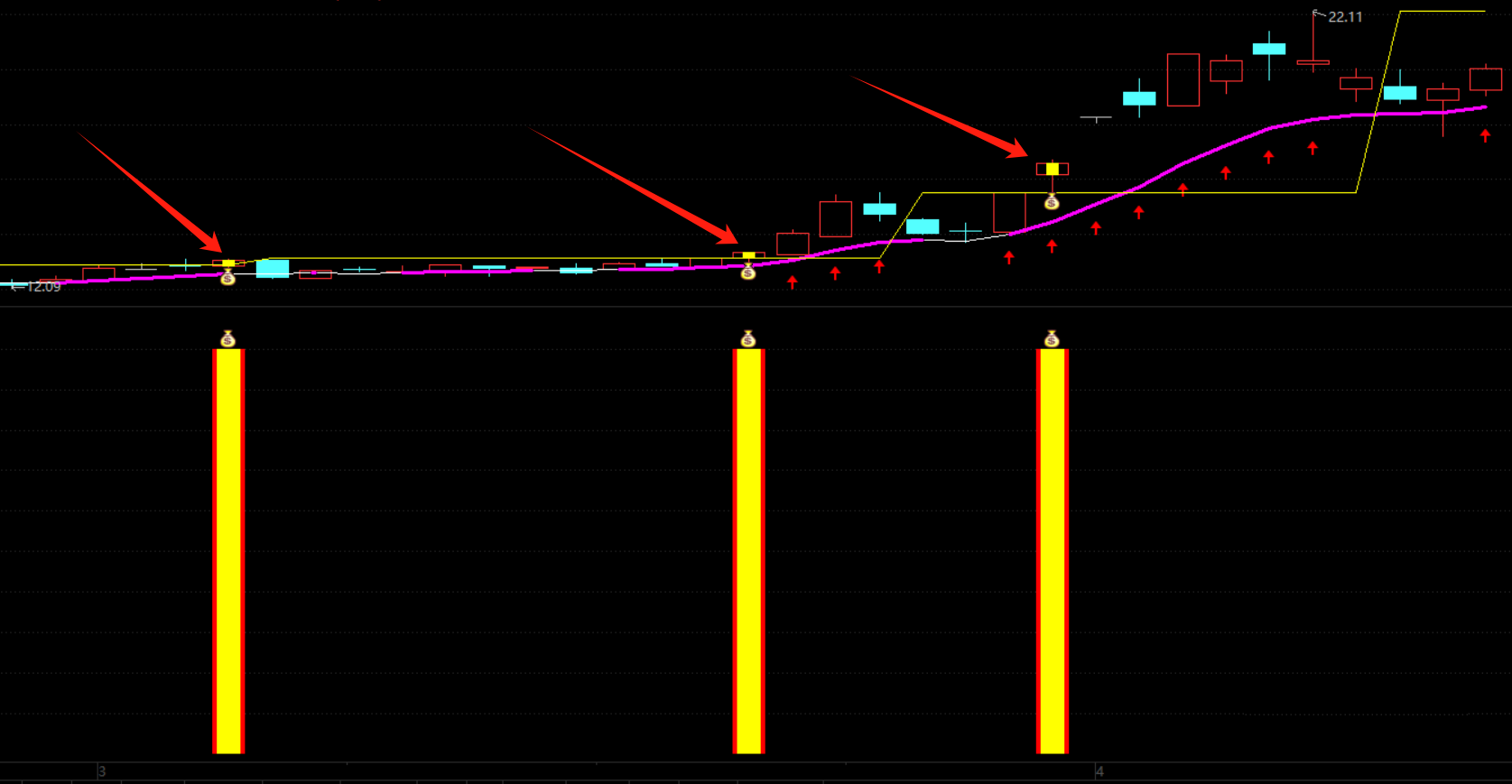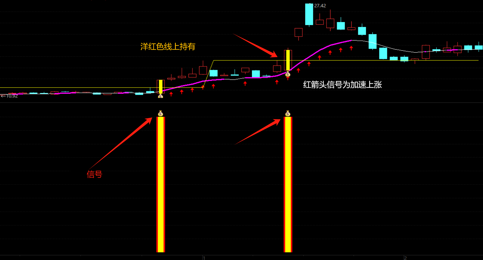 洋红色线持有 ,“红箭头”信号加速,“钱袋子”为信号位。