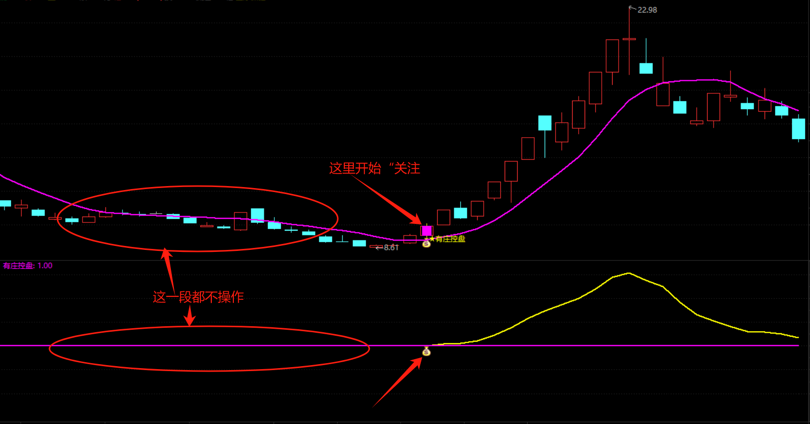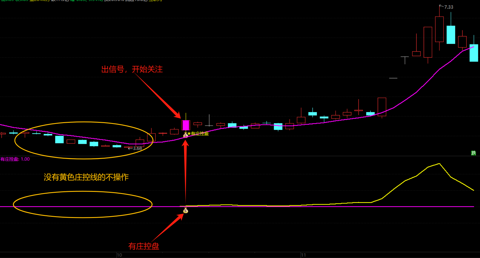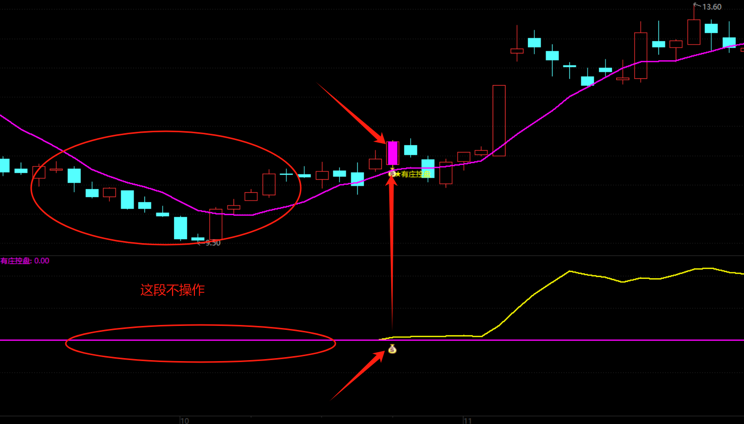 1、“钱袋子”信号代表有庄控盘;黄色线标识开始控盘;洋红色线表示无庄控盘。