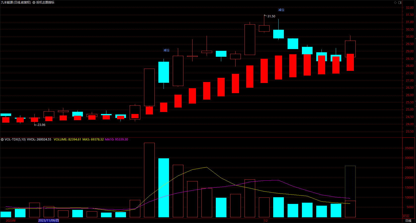 AND CLOSE<MA(CLOSE,13)*1.3,1,0),LOW*0.98,'投机'),COLORRED;