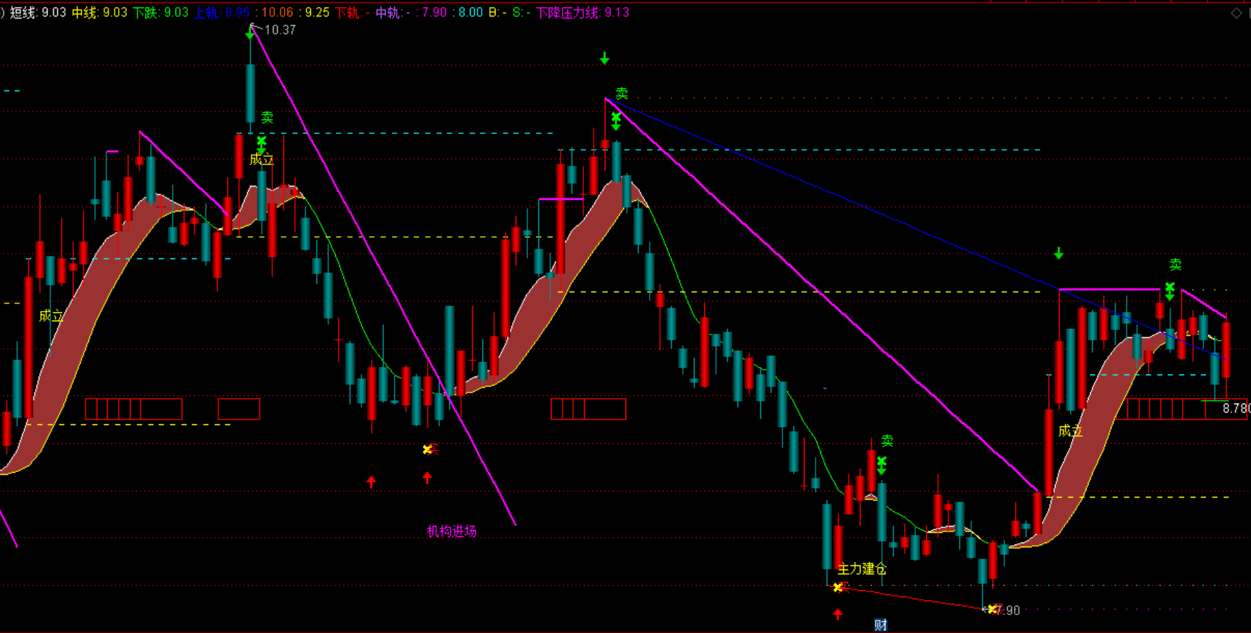 (通达信机构进场买卖点短线中线上轨下轨中轨下降压力线幅图指标公式源码下载)