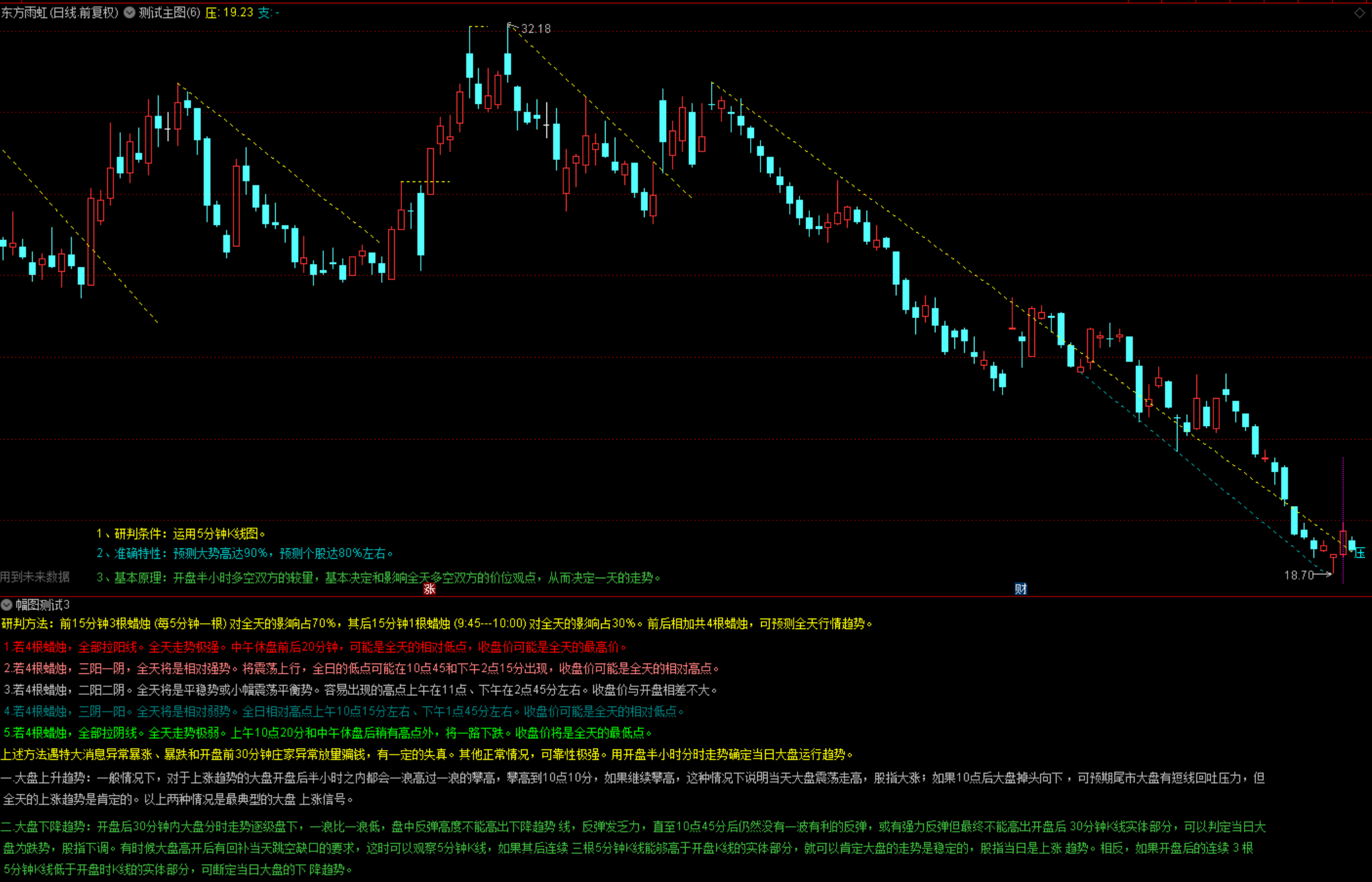 浪低,盘中反弹高度不能高出下降趋势线,反弹发乏力,直至10点45分后仍然没有一波有利的反弹,或有强力反弹但最终不能高出开盘后 30分钟实体部分,可以判定当日大大盘下降趋势: 开盘后30分钟内大盘分时走势逐级盘下浪比这可以观察5分K线,如果其后连续 二根5分钟K载的高于开盘实体部分,就可以肯定大盘的走势是稳定的,股指当日是上涨 趋势。相反,如果开盘后的连续 3根盘为跌势,股指下调。有时候大盘高开后有回补当天跳空缺口的要求,5分钟K线低于开盘时K线的实体部分,可断定当日大盘的下降趋势。