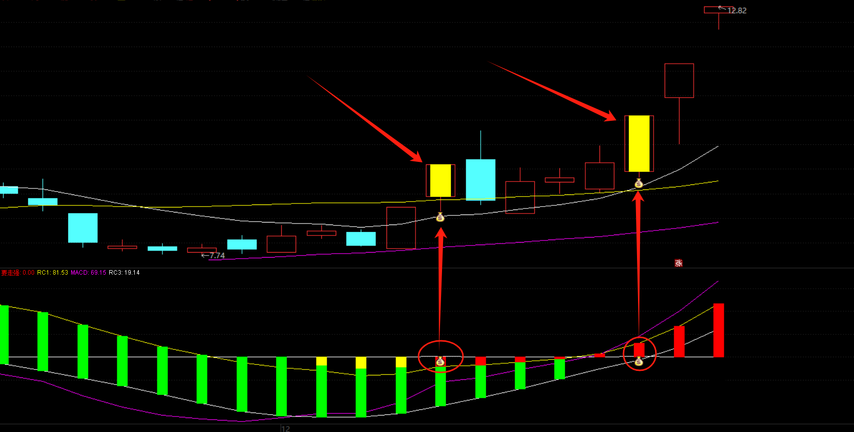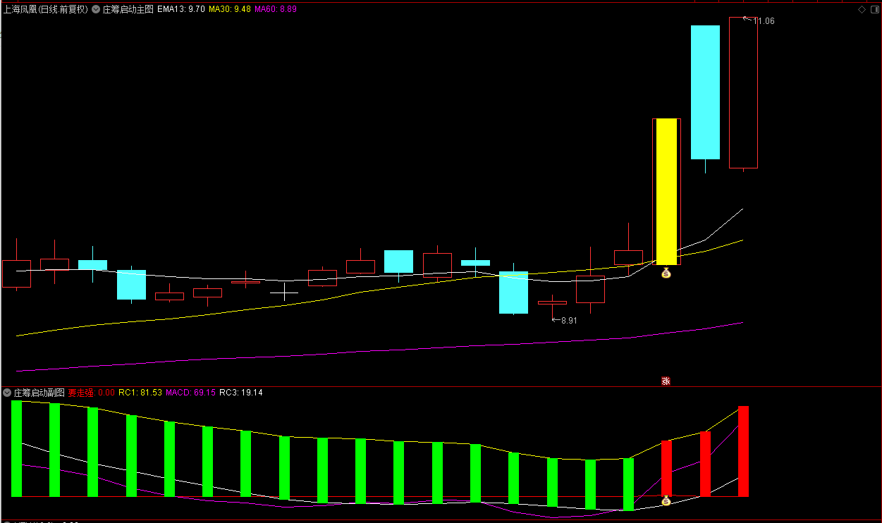 庄筹信号出现,出“钱袋子”启动信号,观察五日均线位置,起涨抓龙。