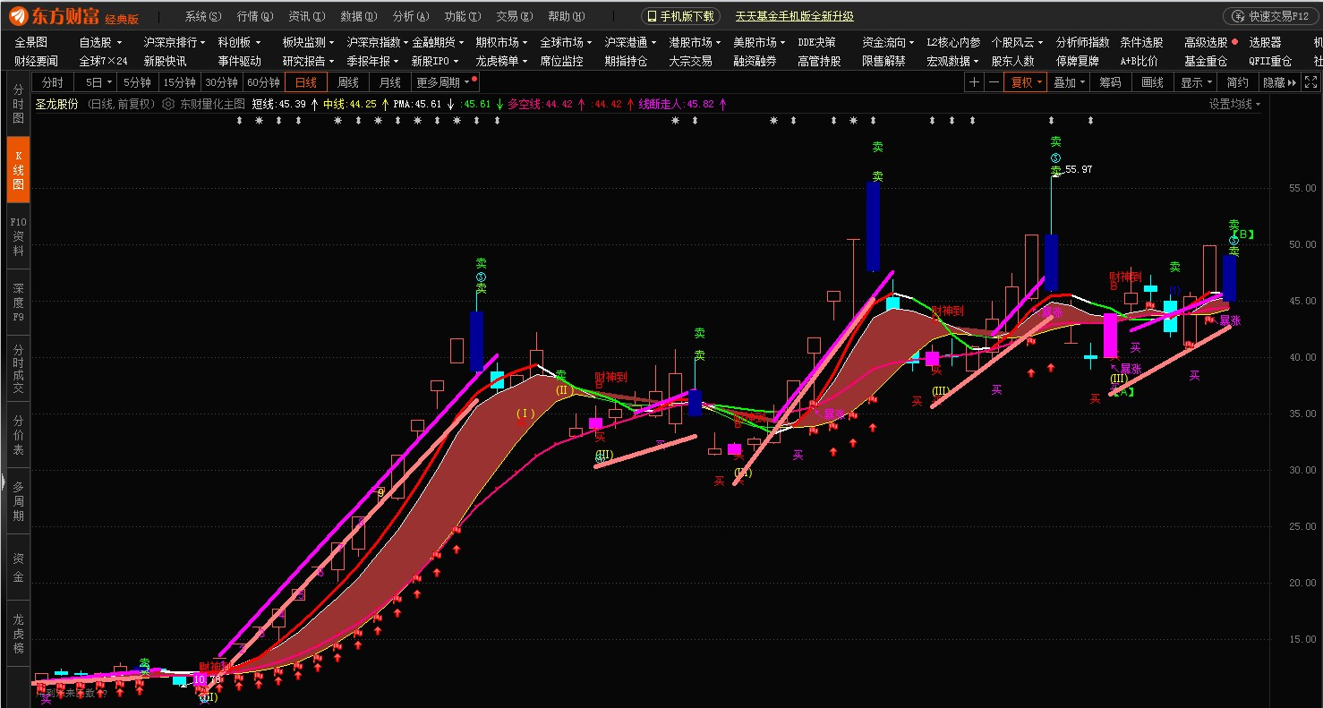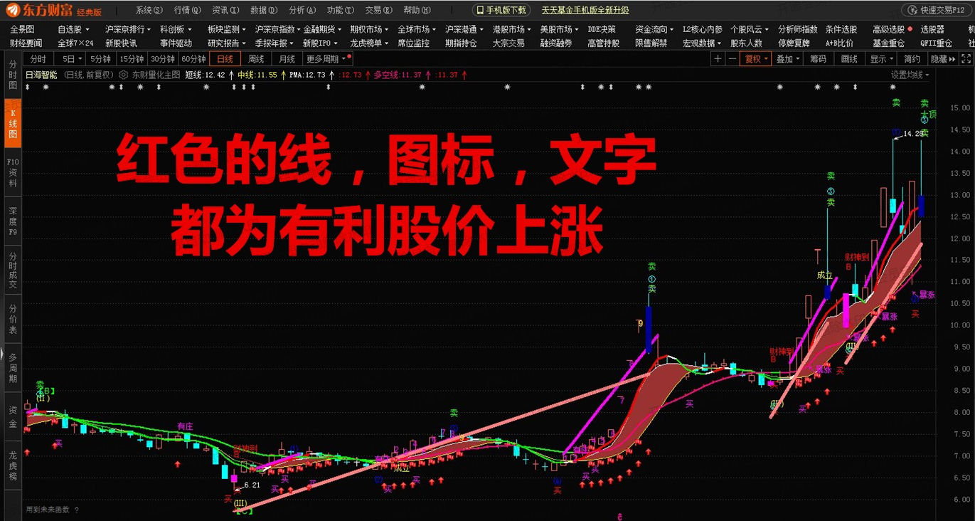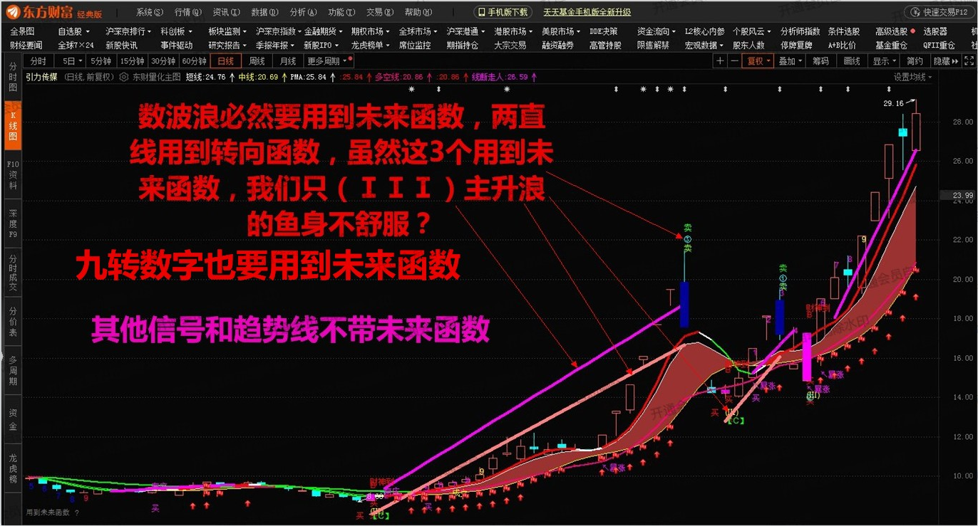 (东方财富量化主图指标。带九转和数浪型主图,有红色彩带和4条趋势线红买绿卖。有庄,财神到,买卖提示。)