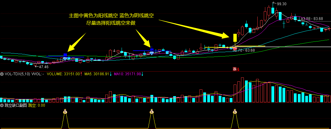 1、主图中黄色为阳线跳空,蓝色为阴线跳空;(尽量选择阳线跳空来做)