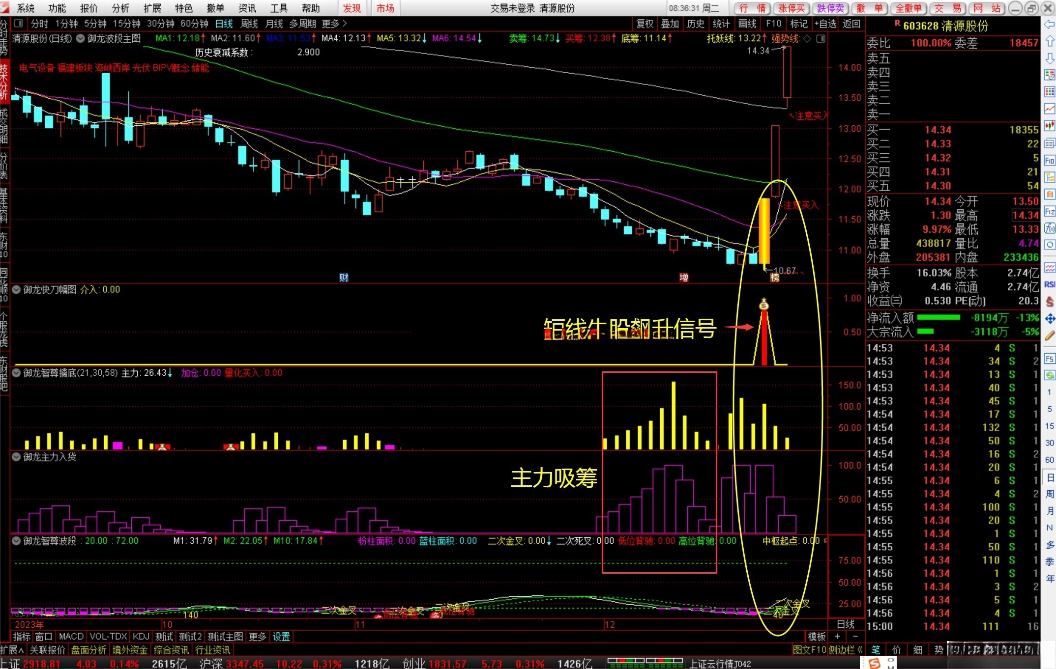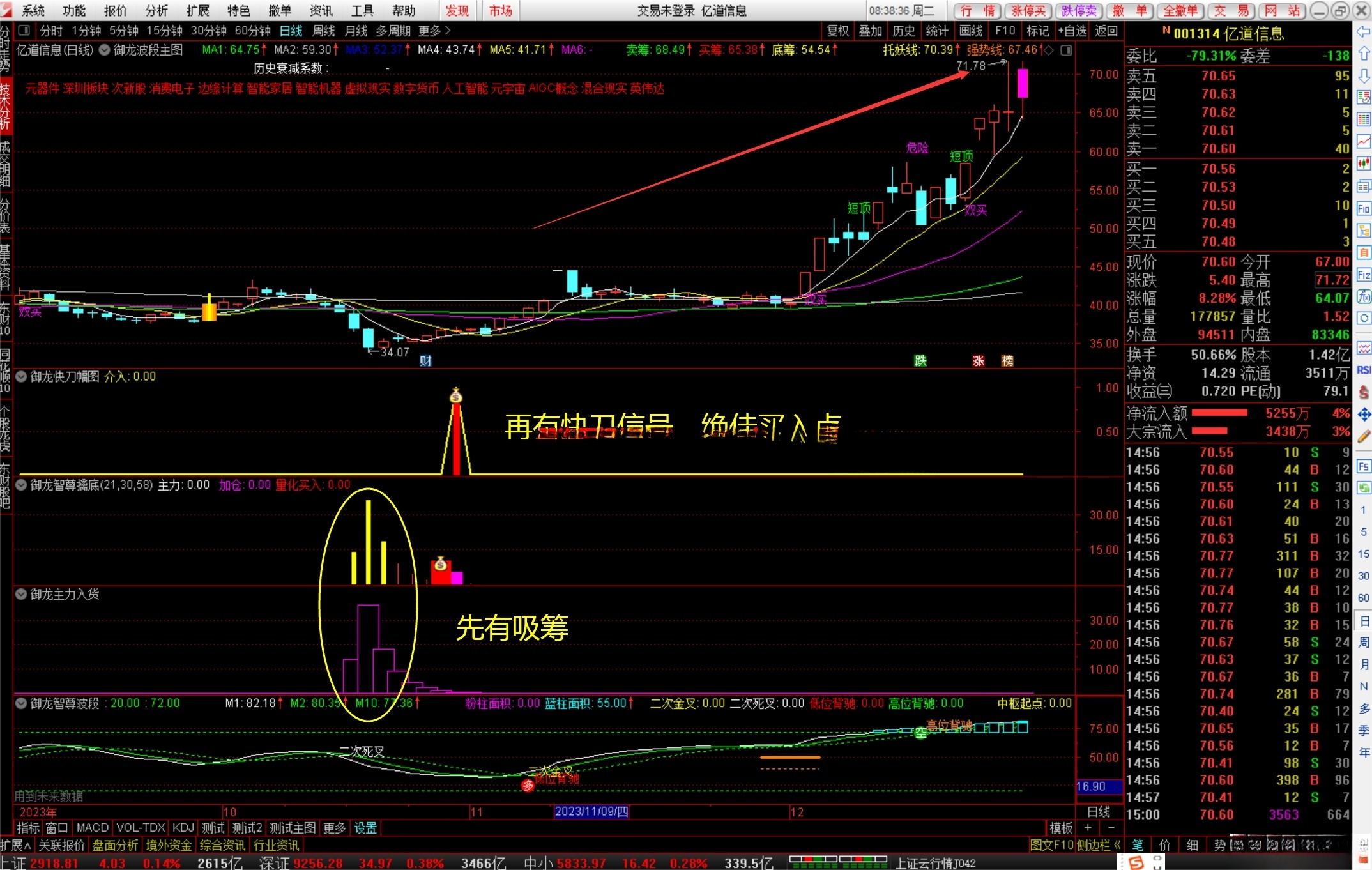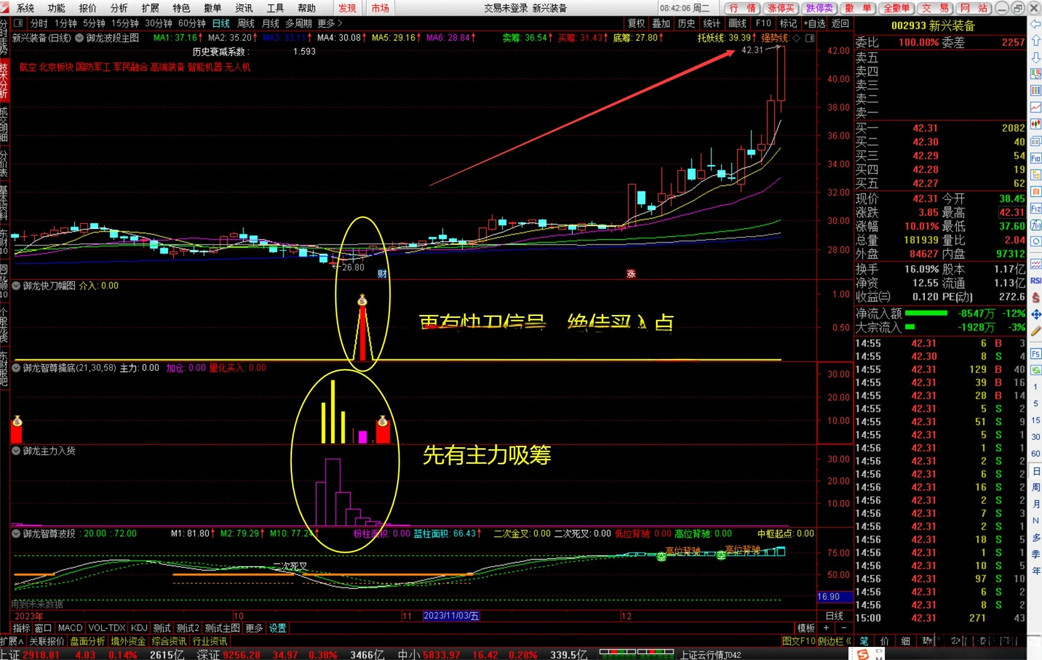 此套指标需要组合使用,先看是否有主力吸筹,再看是否有快刀介入信号
