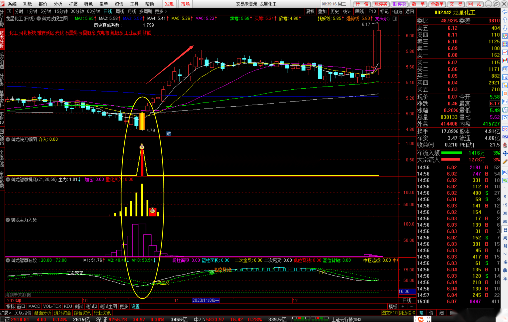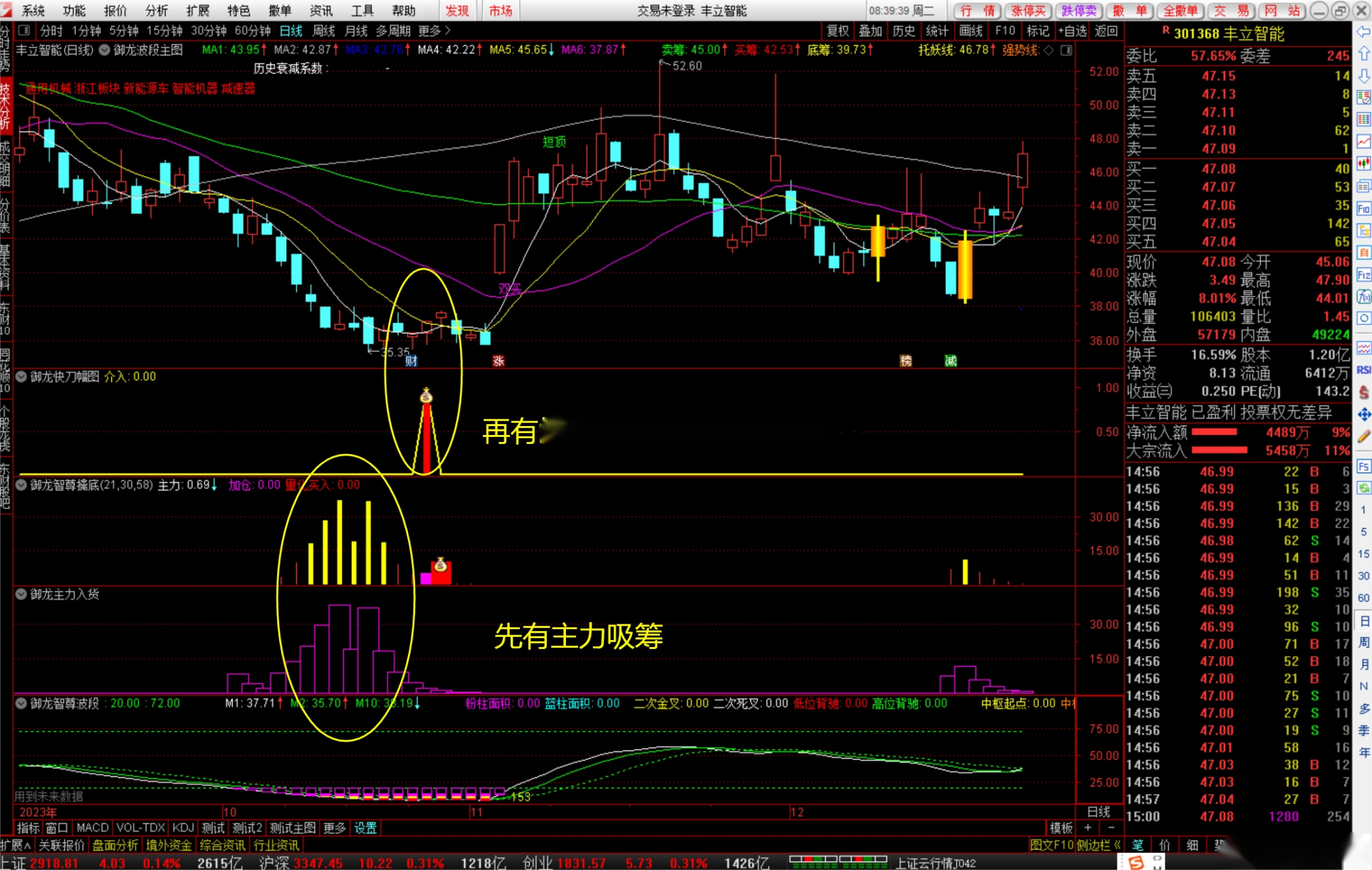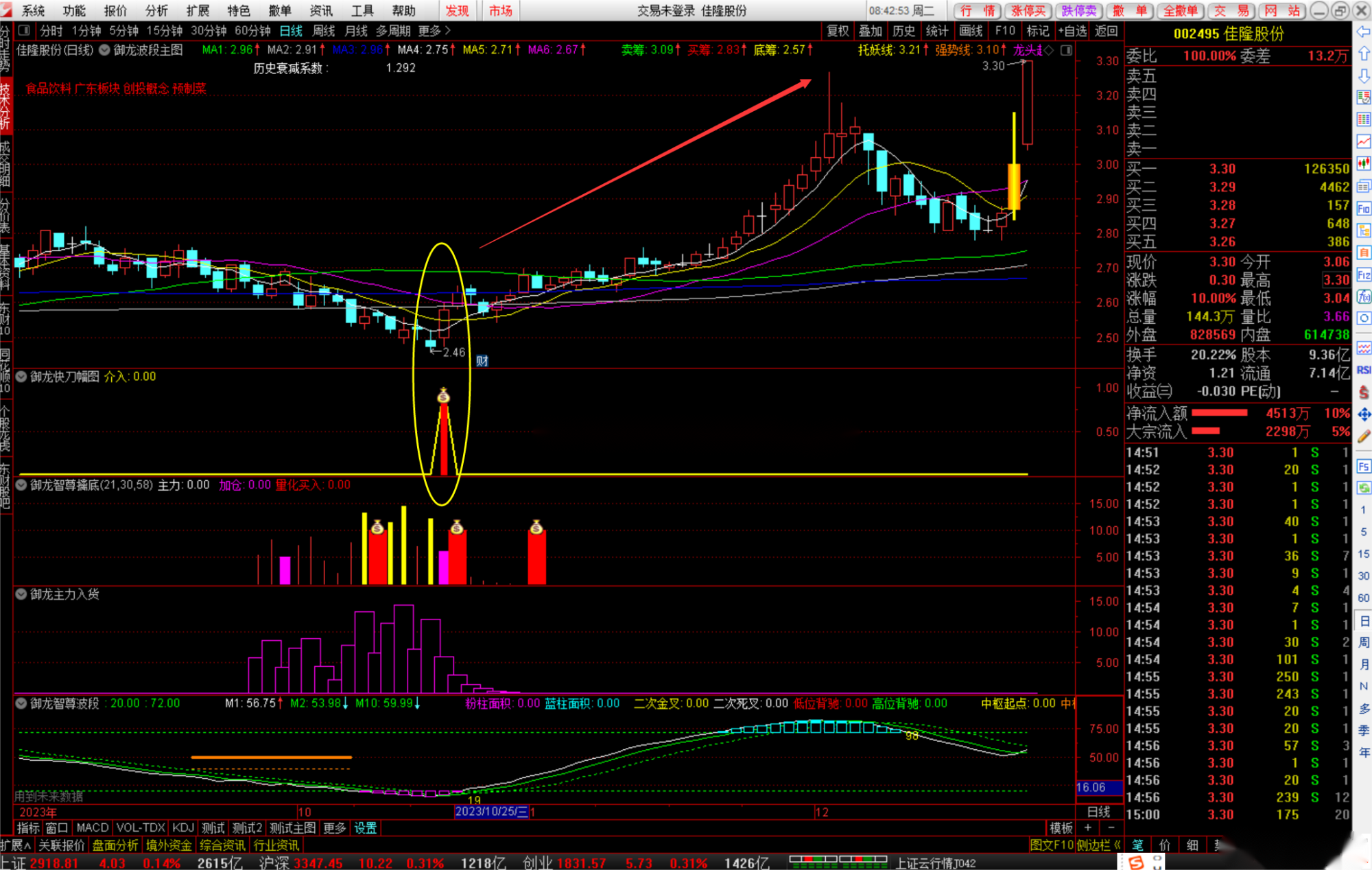 此套指标需要组合使用,先看是否有主力吸筹,再看是否有快刀介入信号