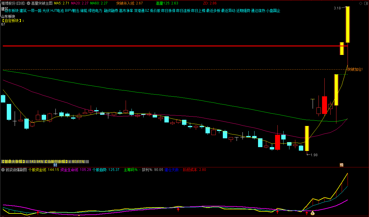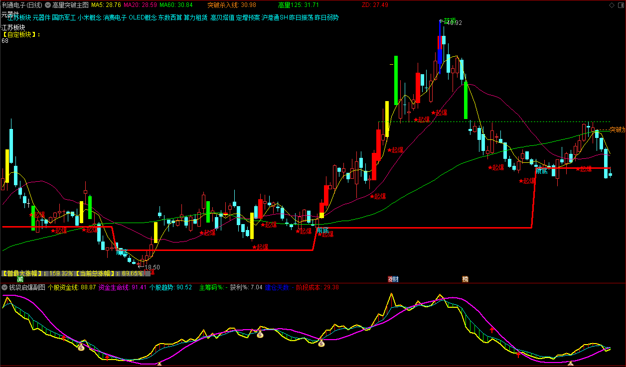 (【通达信】高量突破主图+钱袋启爆副图指标,源码分享)