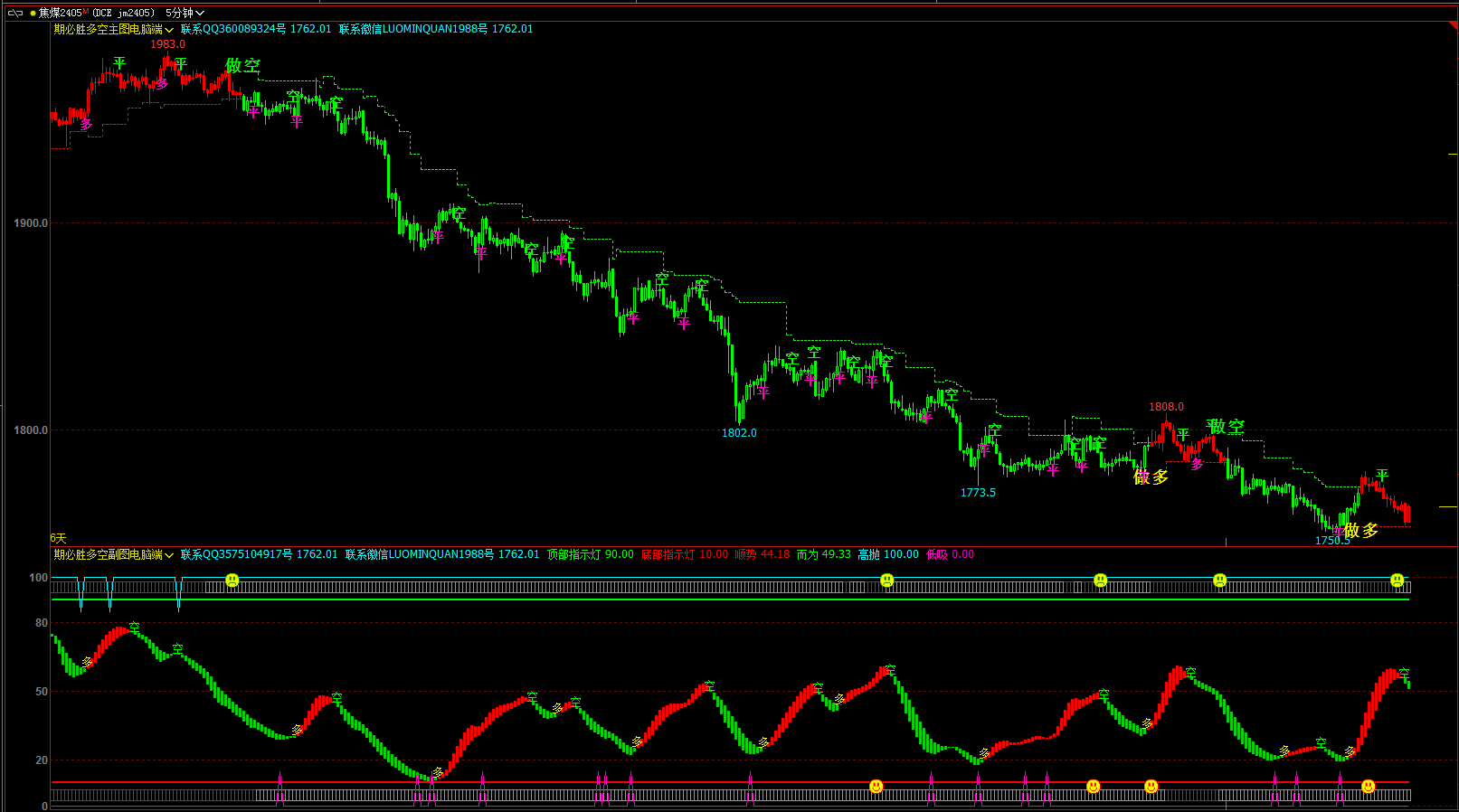 使用解释:以纯碱5分钟为例,绿色虚线代表的是压力位,红色虚线代表的是支撑位,每个周期的压力位和支撑位不一样,也称作移动价格保护线,根据价格变动,该支撑位和压力位会产生相对应的变化,做法有很多种,当主副图同时绿,做空,当主副图同时红,做多,比较简单实用,指标紧供学习研究使用,不作投资建议,入市有风险,投资需谨慎。