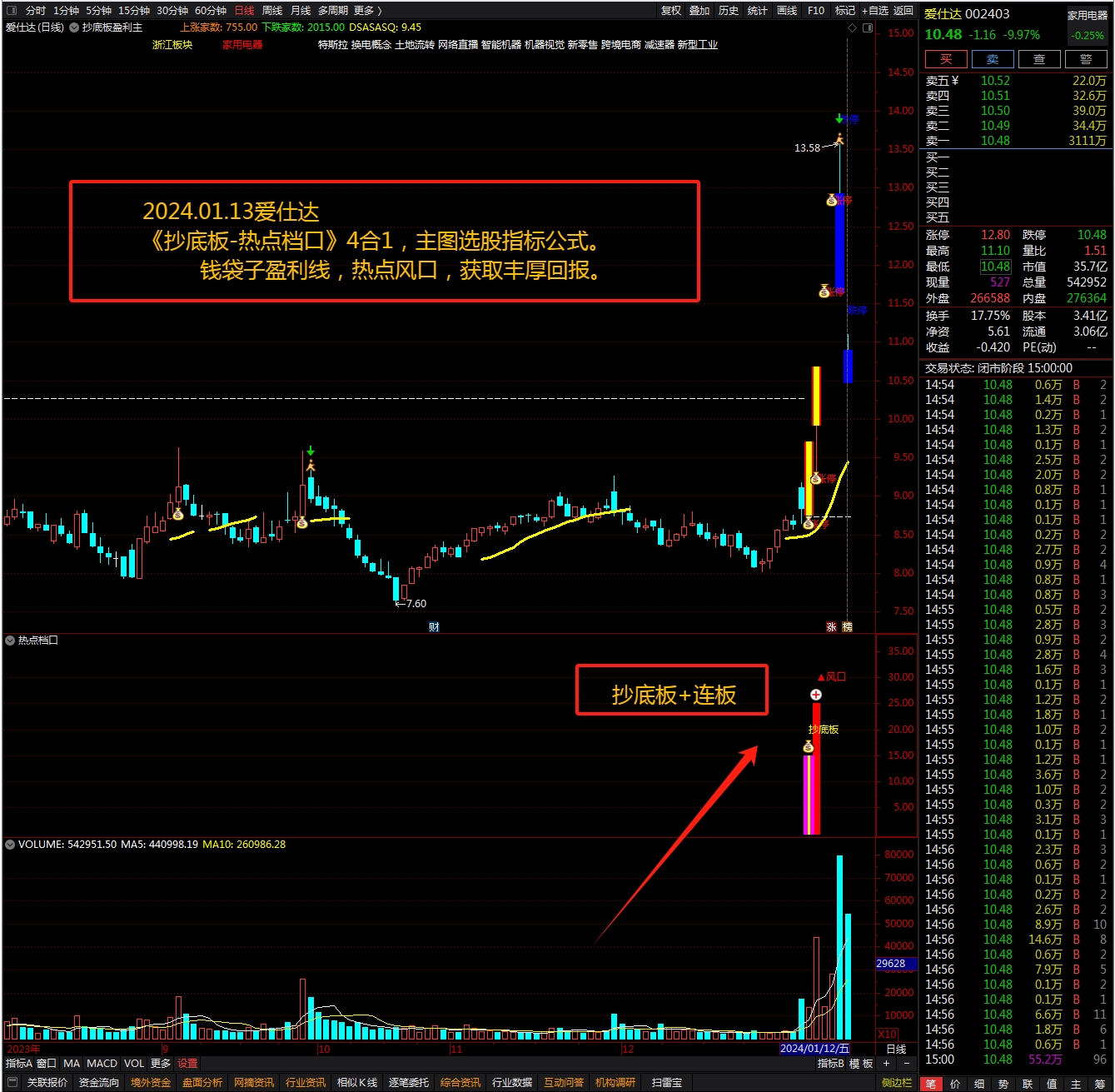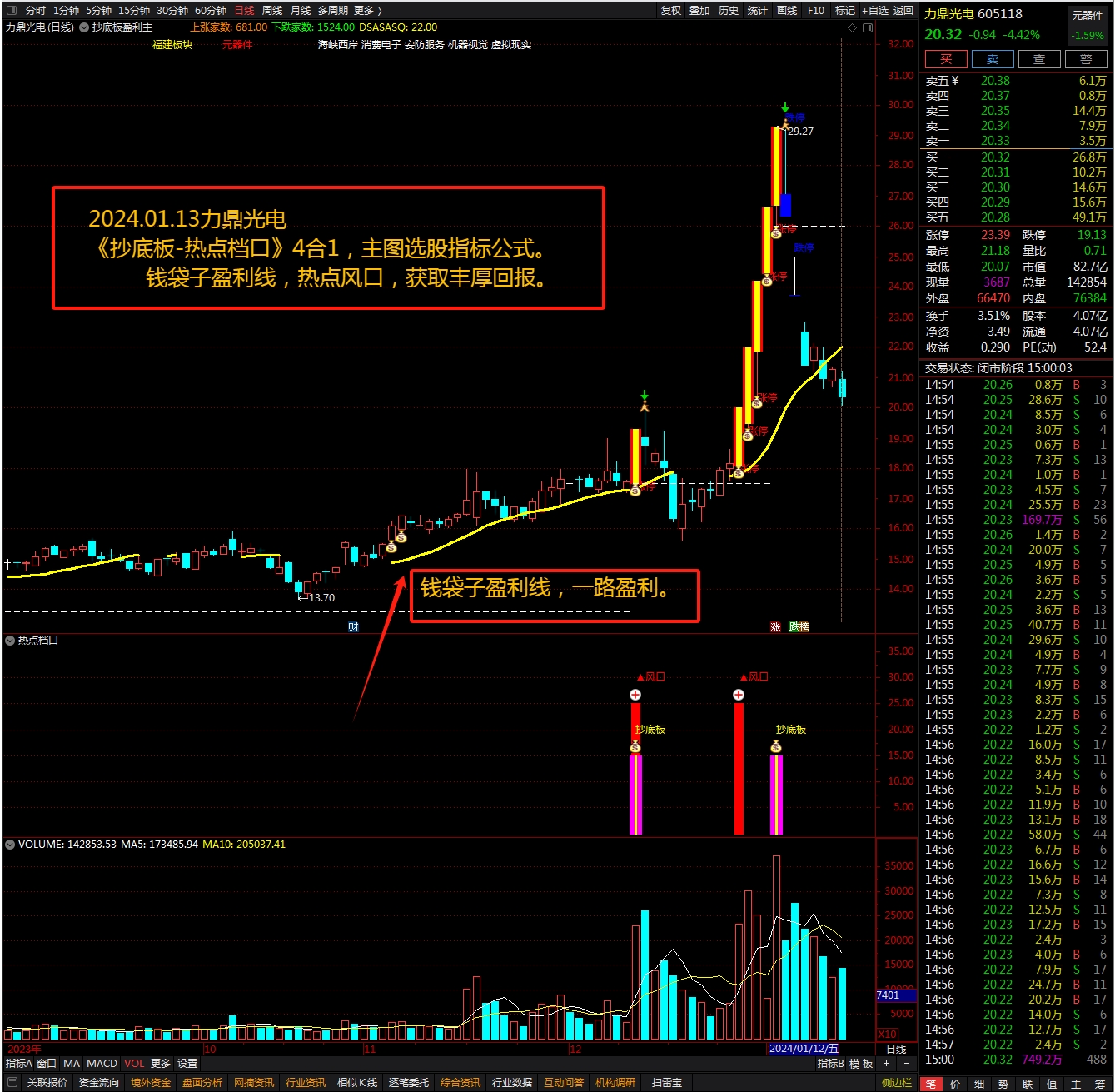 (2024《抄底板》4合1,主图选股指标公式。钱袋子盈利线,热点风口,获取丰厚回报。 )