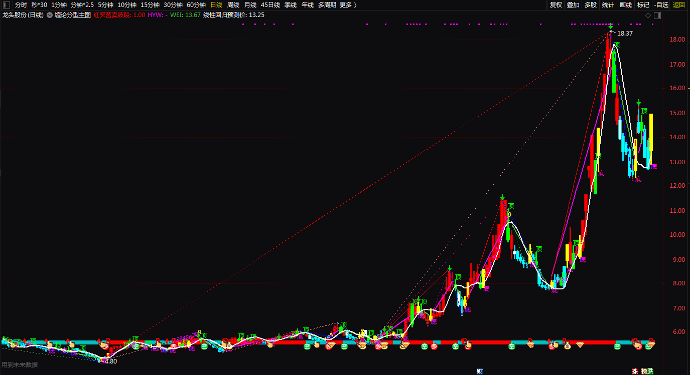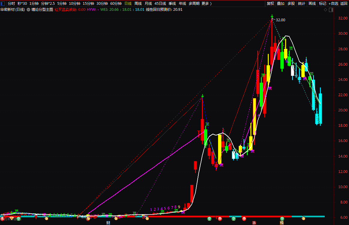 缠论分型主图,有底分型,顶分型K线结构,九转数字,长中短趋势划线,波段线,线性回归预测价。