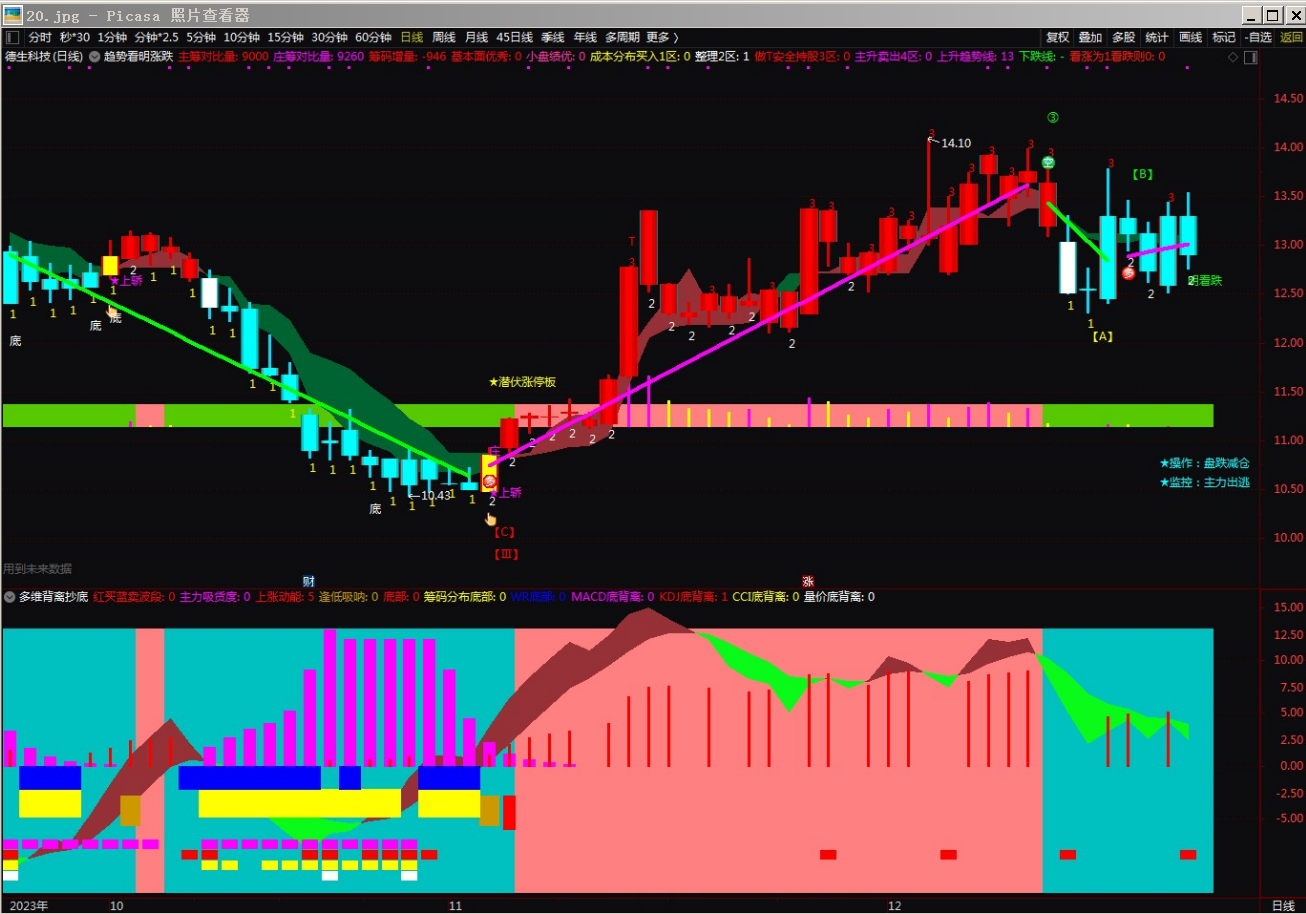 12. 量价底背离: 在副图底部用白色小方形显示。
