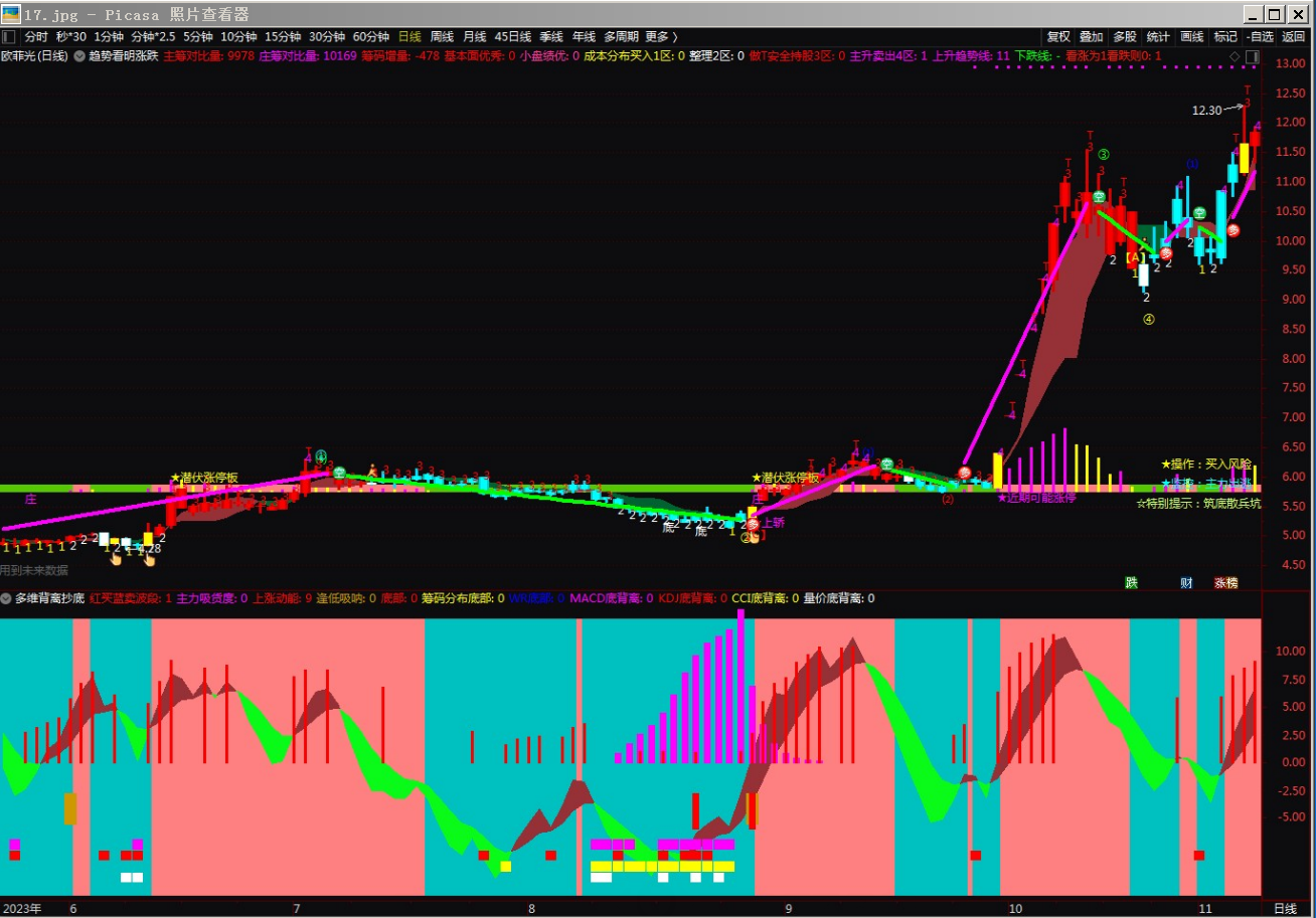 10. 每个股票右下角每天都有操作提示:买入风险,卖出风险,追涨博弈,稳健持股,盘跌减仓,杀跌空仓 。监控提示:主力增仓等。☆特别提示:筑底散兵坑等。