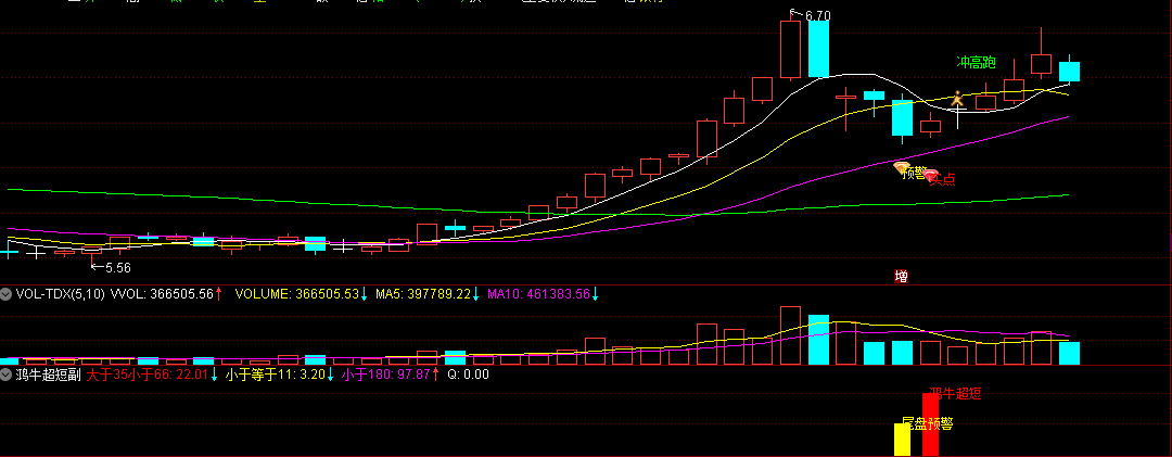 2、预警出来的股票第二天副图进行观察,鸿牛超短红色柱状图
