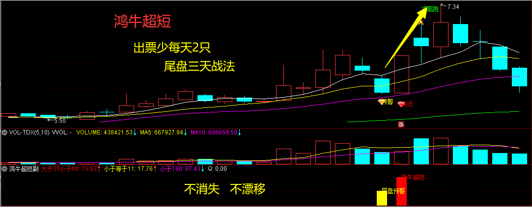 本指标为超短线三天指标。理论止盈点为1个点,预警出来 第二天红柱出现即可进场第三天冲高离场,切勿留恋