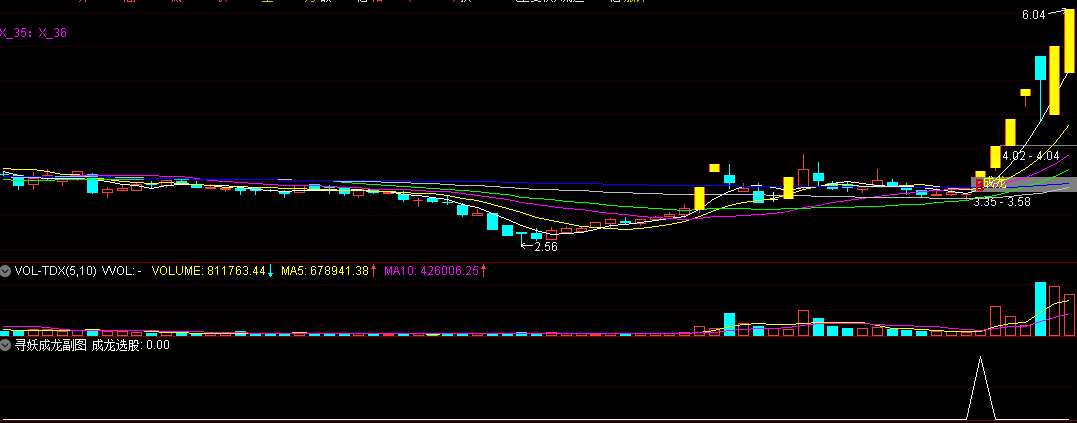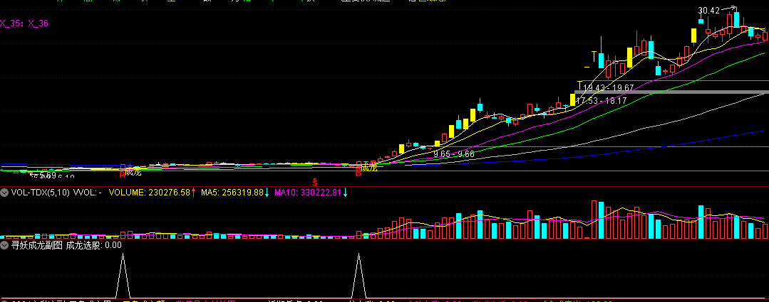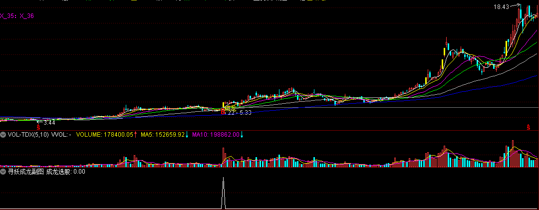 4、主图中黄色柱子上的“成龙”信号,是妖股突破的绝佳买入点。