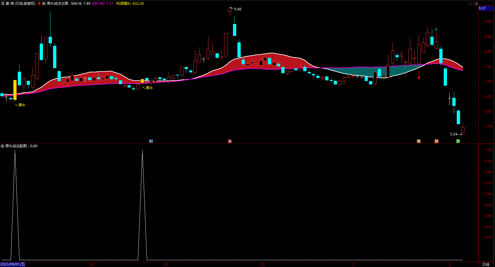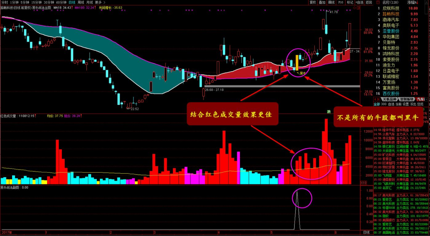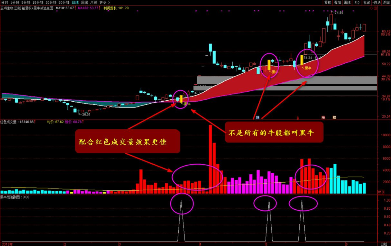 主图红色区域,“黑牛”提示上涨,副图三角形信号买进!