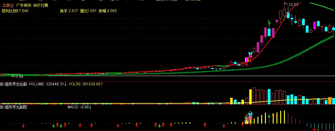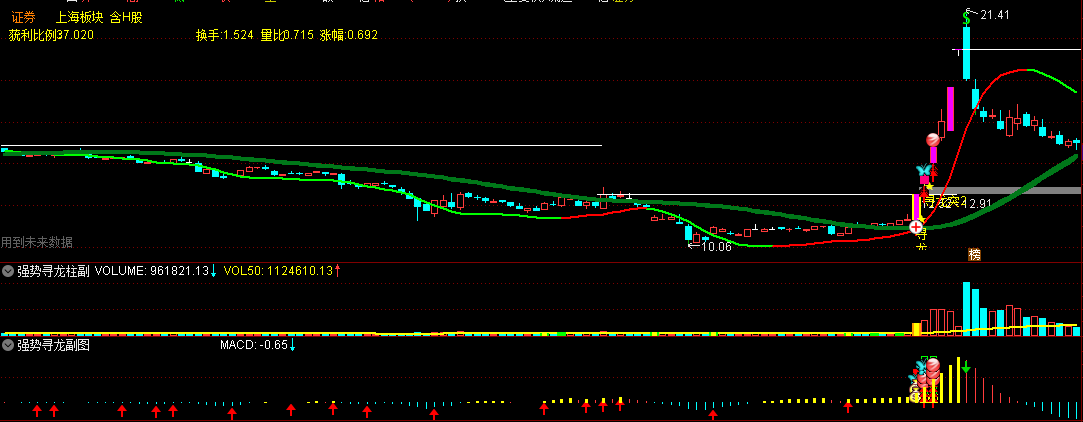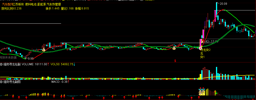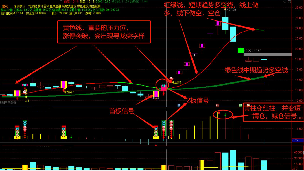 股价突破了粗绿色趋势线,代表日线转多,如果当天放量涨停突破了粗绿色趋势线,并且寻龙柱量能打到黄线,代表有大资金介入,可以算起涨点,要结合价格和成交量综合分析