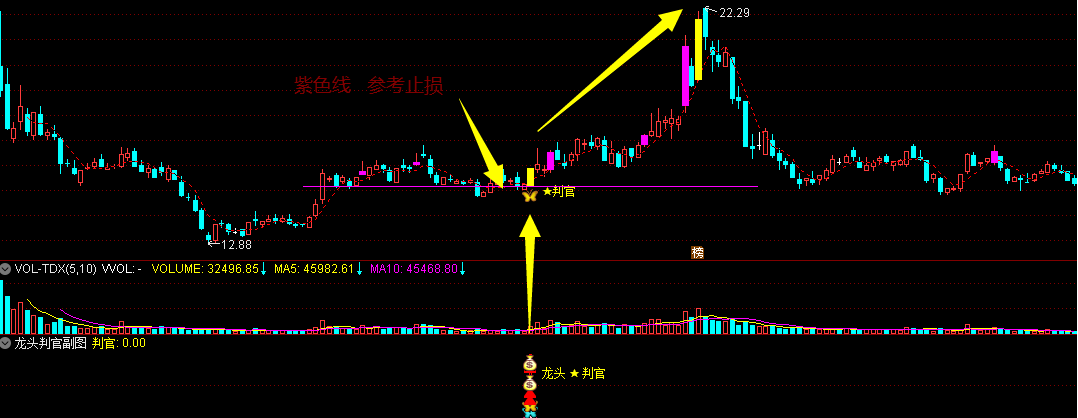 14、主图中紫色横线位置是出信号当天的开盘价,部份失败信号可参考调整过后再次上穿此价位时择机操作。