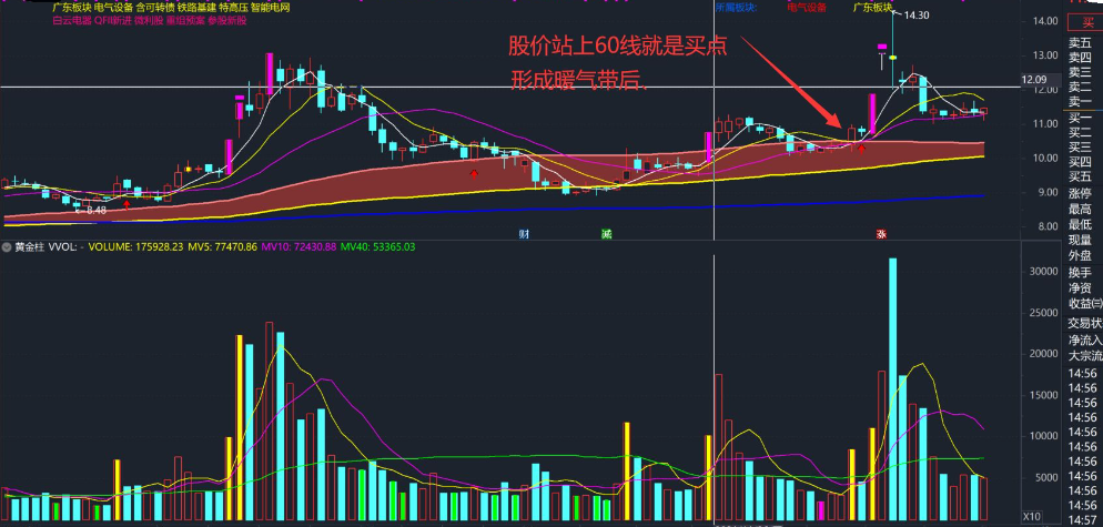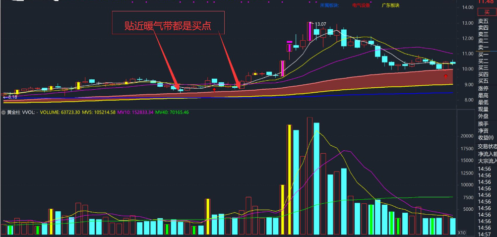 1.其实是趋势回调的买点,永远只做趋势向上。暖气带是60线上穿120线。成功率也高。