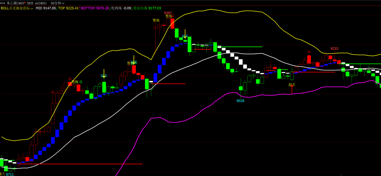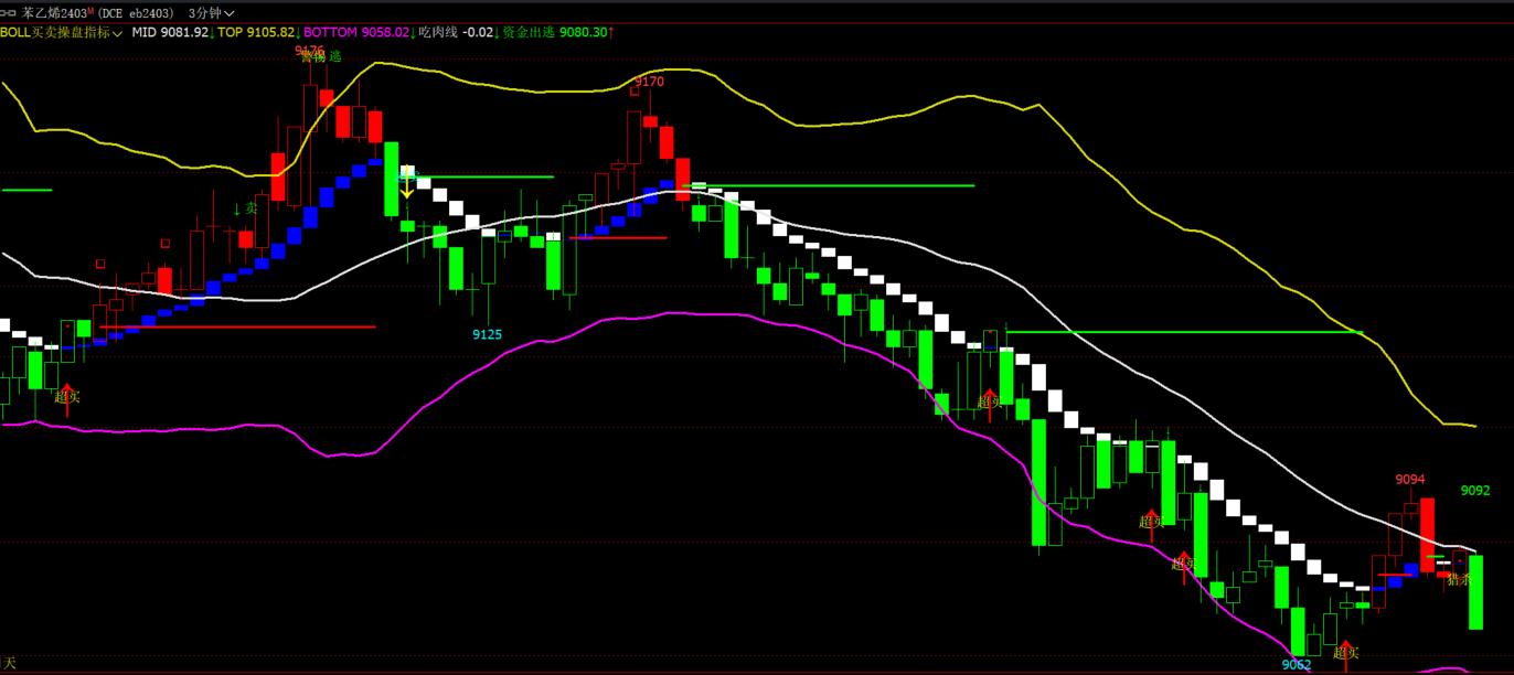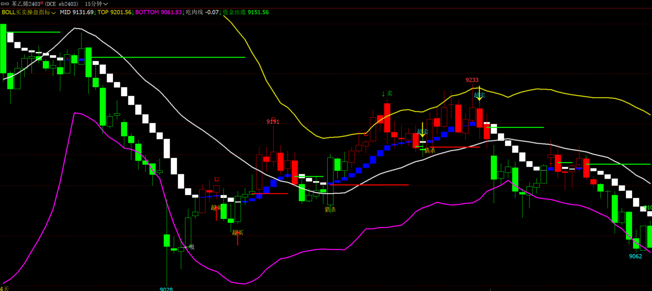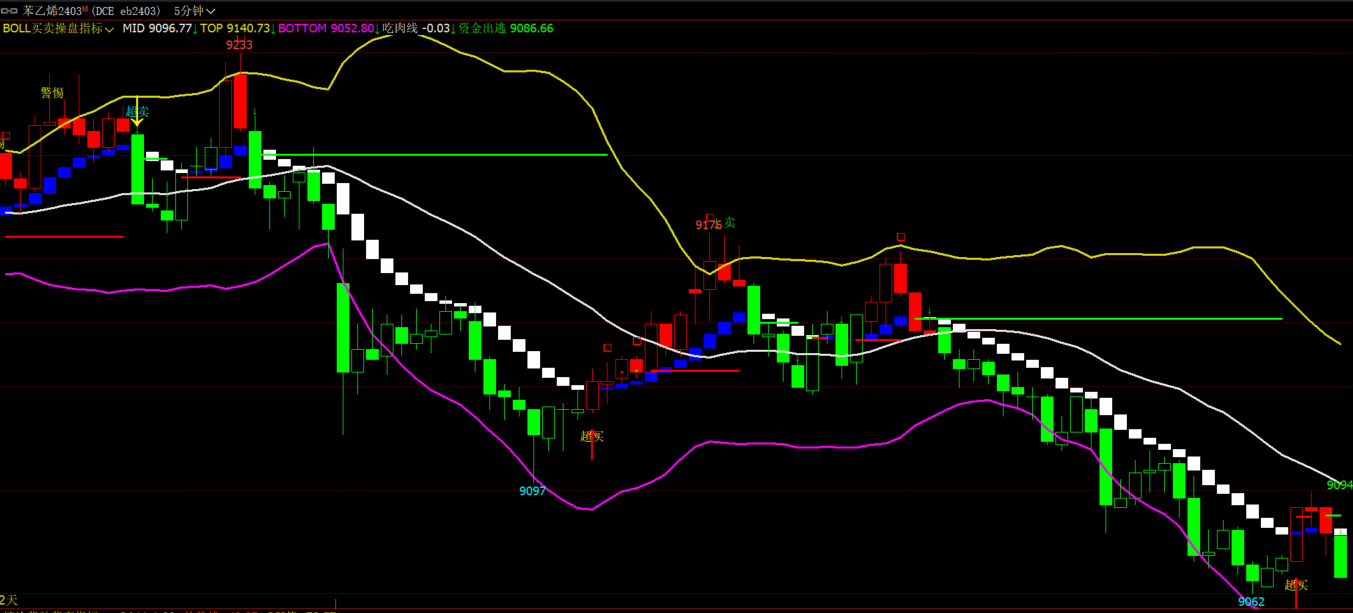 (文华财经boll+多空波段趋势柱+支撑压力画线操盘指标)