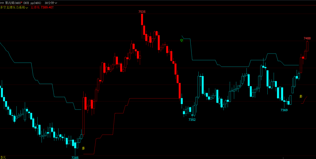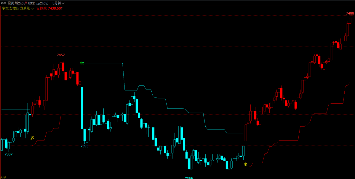 (文华财经期货支撑压力自动画线+K线变色多空波段指标)